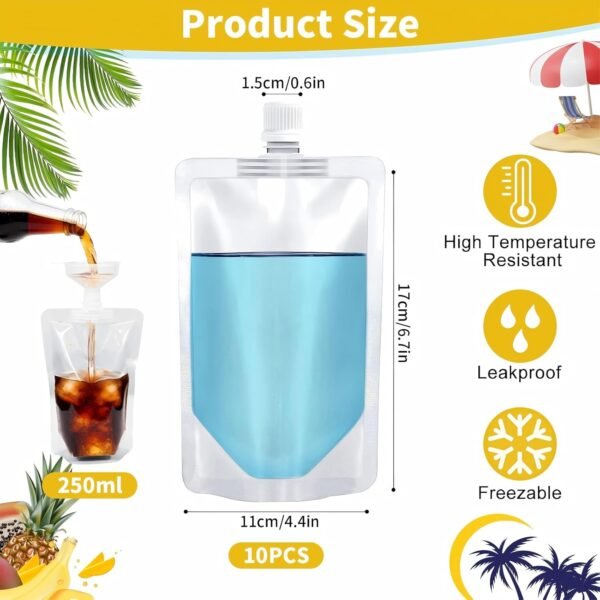 10PCS 250Ml Reusable Travel Drink Pouches – Leakproof Plastic Hip Flask with Screw Cap, Alcohol Juice Travel Plastic Flasks Bags, Foldable for Festivals, Events, Camping, Hiking (Straight Spout)