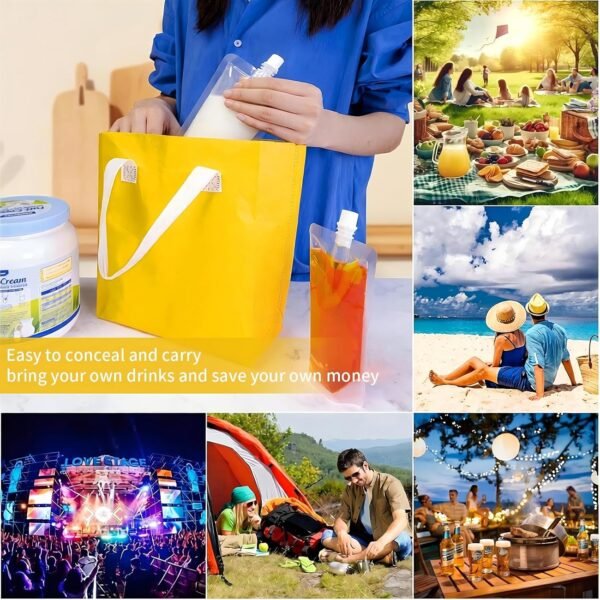 • 【Foldable & Lightweight】These travel drink pouches are ultra-light and fully foldable—when empty, they tuck into a tiny, flat bundle that fits in your pocket, toiletry bag, or hiking pack. Unlike bulky metal flasks, they take up next to no space—perfect for festivals, road trips, international travel, or any time portability counts. They’re even discreet enough for those occasions when you want to bring your own drink along.