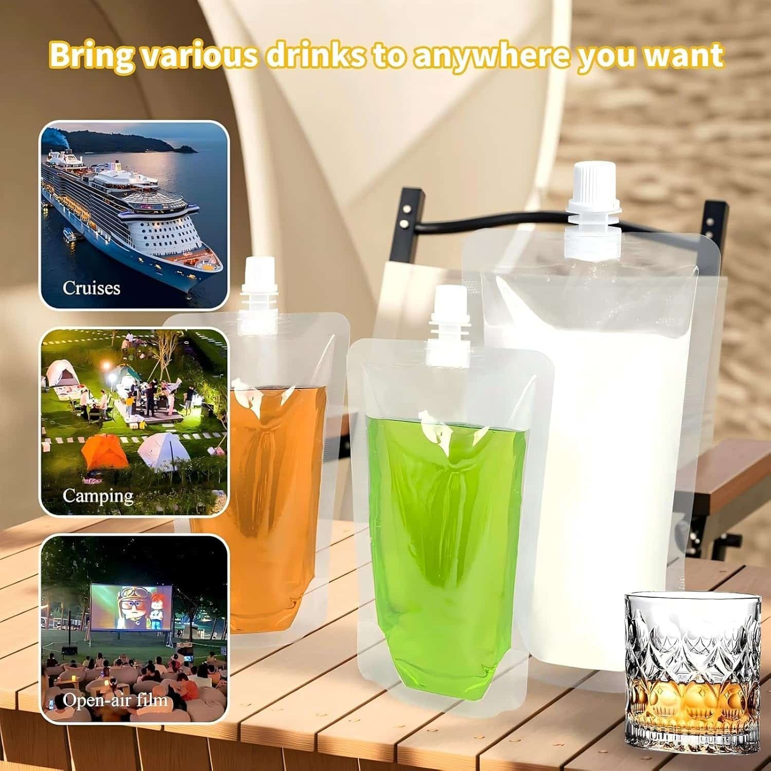 • 【Foldable & Lightweight】These travel drink pouches are ultra-light and fully foldable—when empty, they tuck into a tiny, flat bundle that fits in your pocket, toiletry bag, or hiking pack. Unlike bulky metal flasks, they take up next to no space—perfect for festivals, road trips, international travel, or any time portability counts. They’re even discreet enough for those occasions when you want to bring your own drink along.