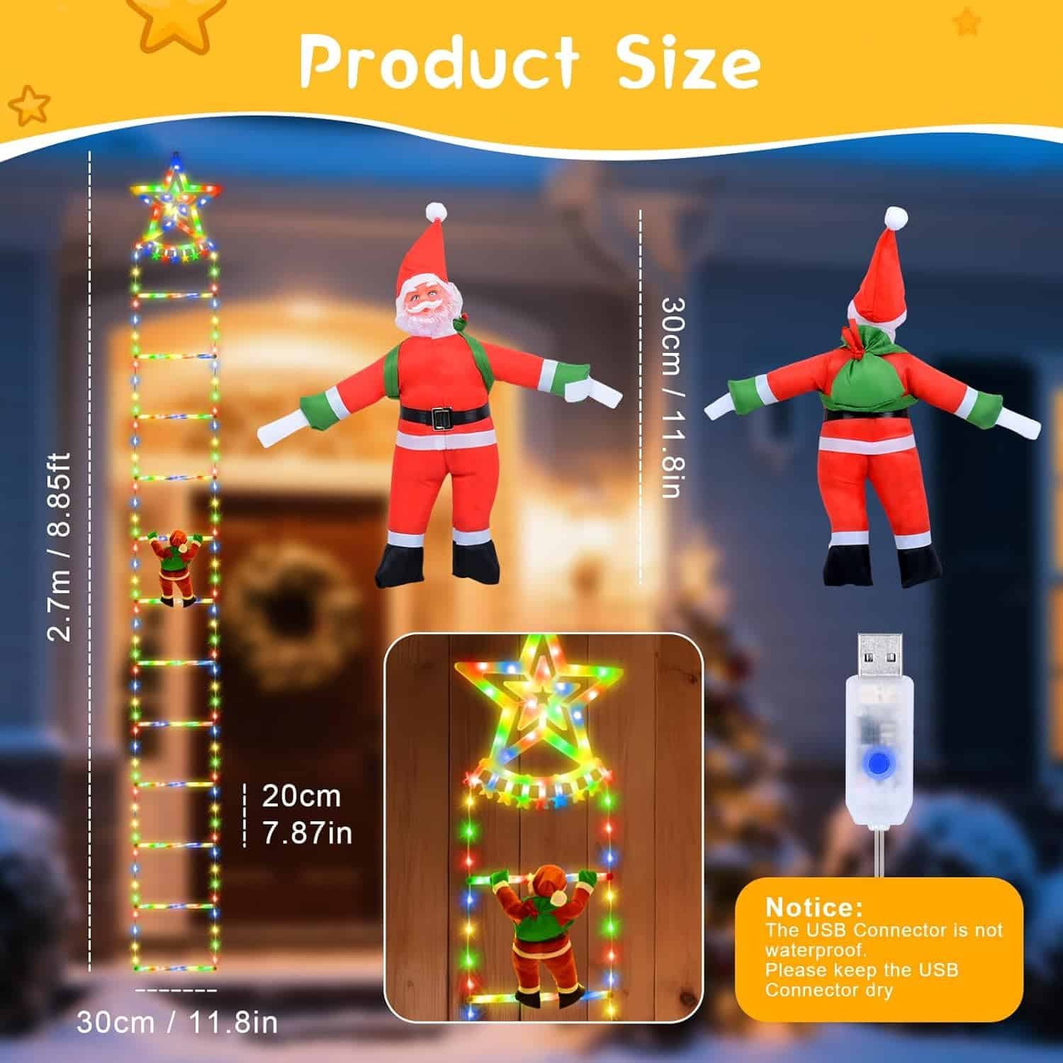 - Waterproof & Safe to Use: This outdoor Christmas ladder lights feature USB charging and LED lights with IP65 waterproof performance, ensuring safe use in outdoor environments. Just keep the detachable santa claus on ladder and USB charge dry. Whether it's indoor Christmas window decorations or outdoor scenes, they can be safely and stably used