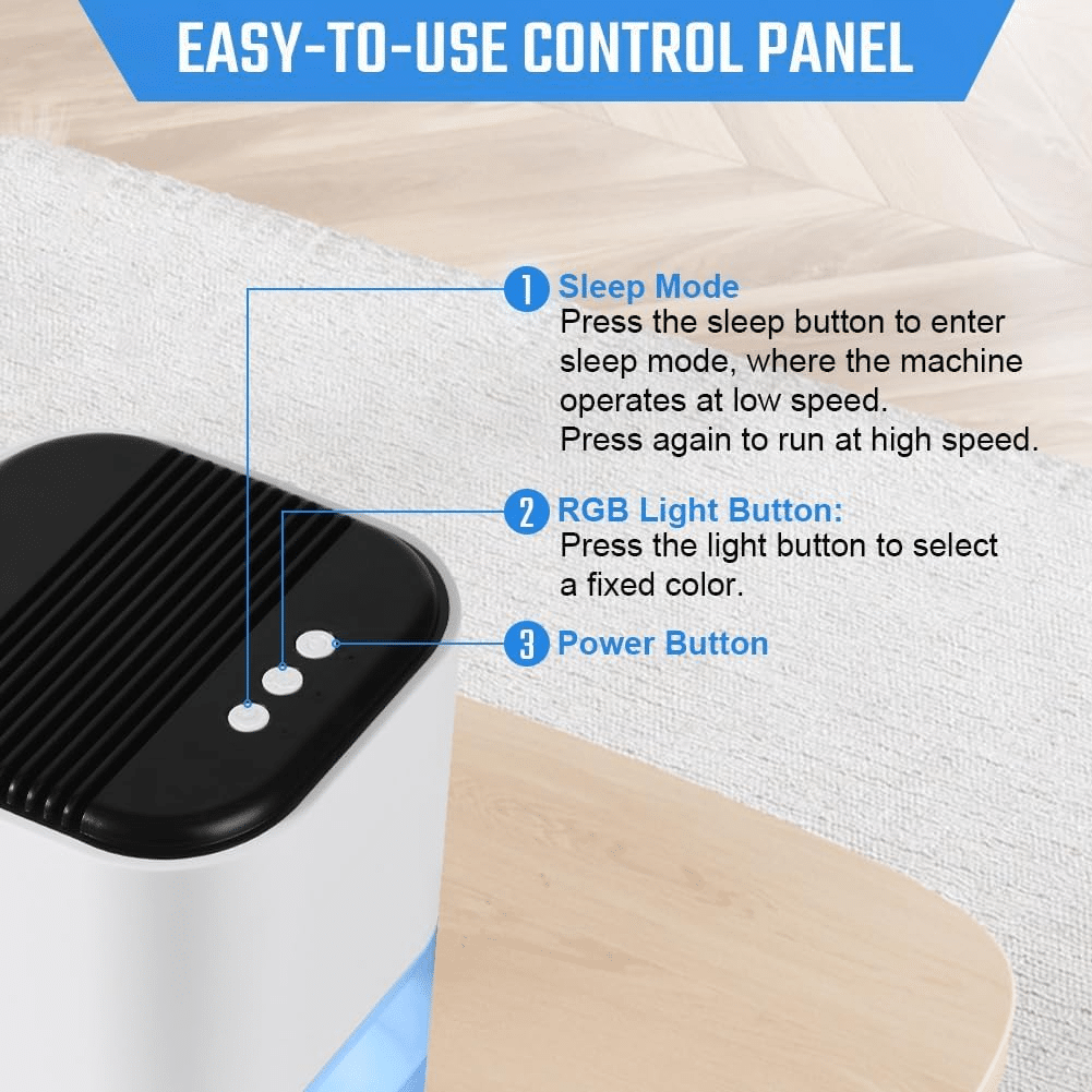 • 【Low energy consumption】 The energy consumption of our dehumidifier is as low as 42w, which allows you to save electricity while also contributing to environmental protection. The three buttons of the product are very simple, divided into the power button, RGB light button and sleep mode, which can be easily operated by the elderly and children.