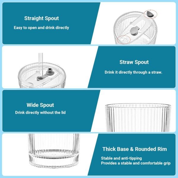 - Glass Cup Set: Includes 4 glass cups, 4 sealed plastic lids, and 4 straight glass straws. You can drink through the glass tube or the small hole at the rim of the cup, or you can drink directly from the rim without the lid. Three ways to drink freely, making it convenient for you