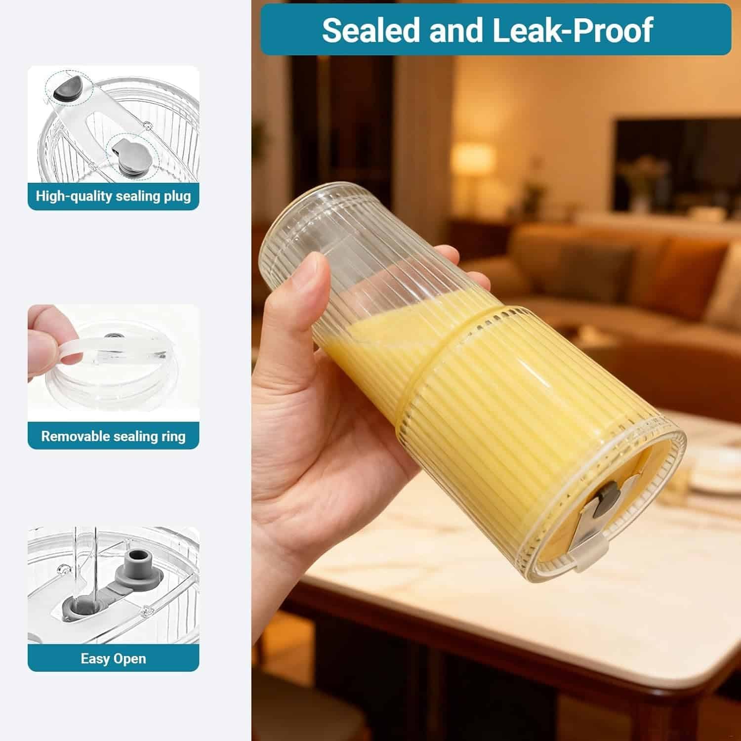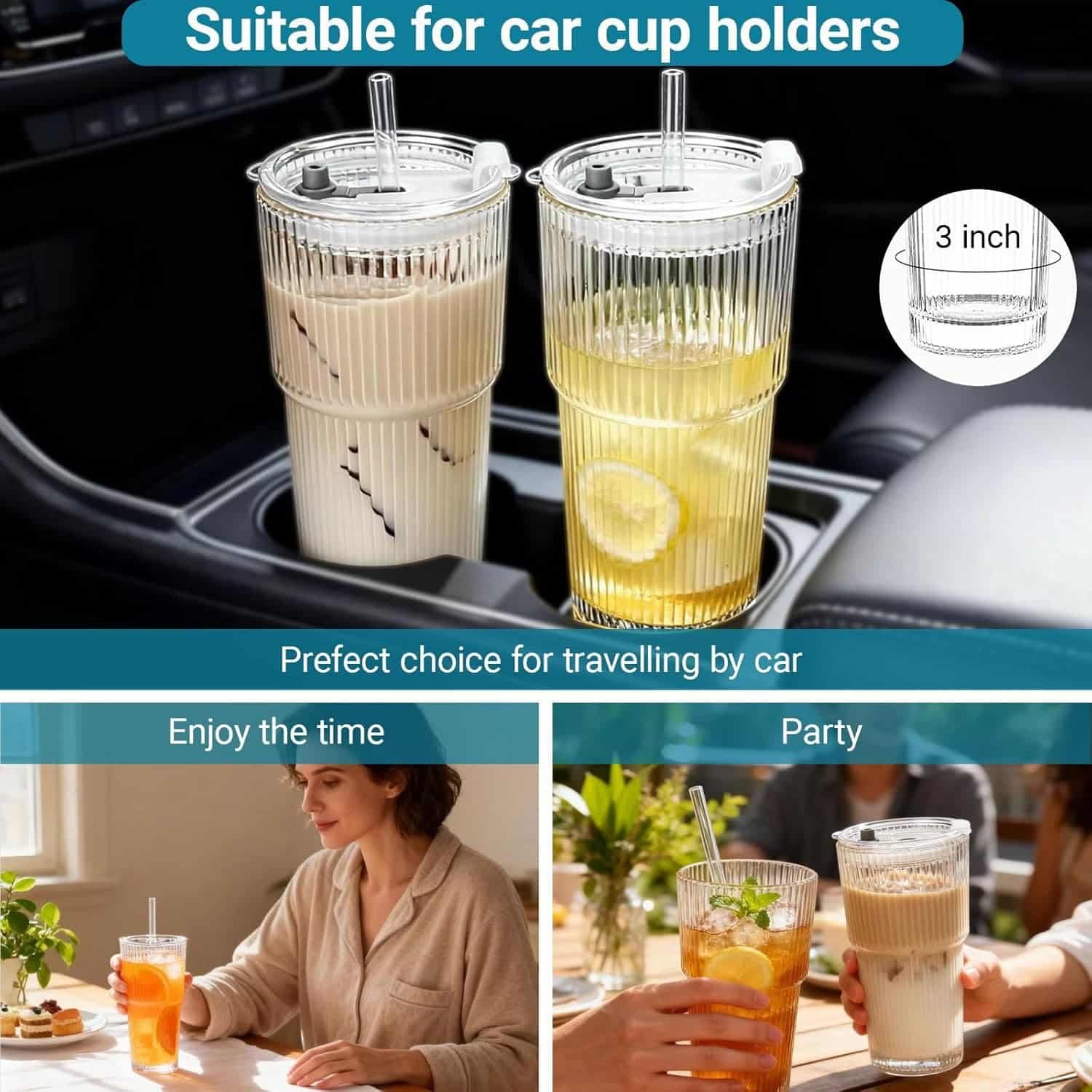 - Leak-proof: This glass tumbler with a sealed plastic lid (with a silicone stopper) and a glass straw to prevent liquid from spilling. Its size is suitable for most standard car cup holders. Therefore, it is very suitable for carrying during commutes, at the office, camping, traveling, or for use at home