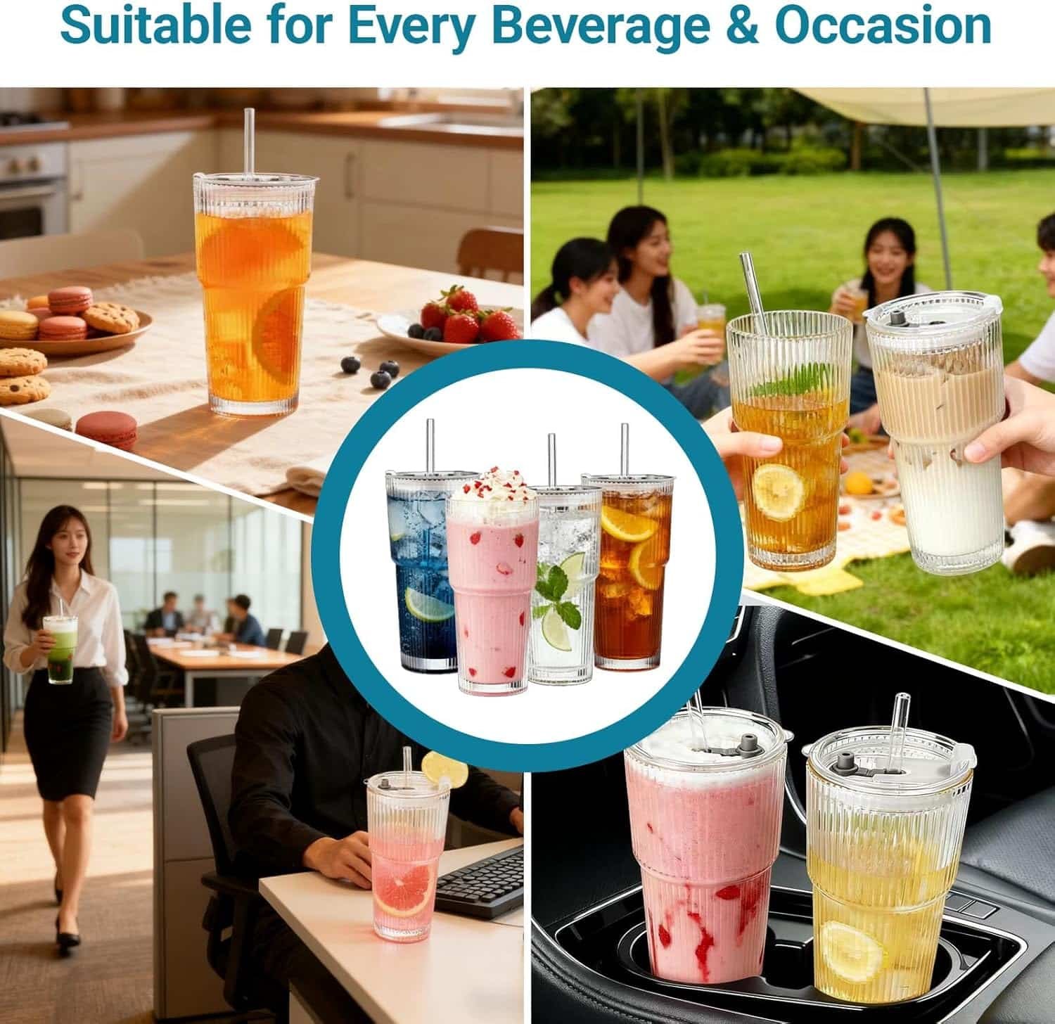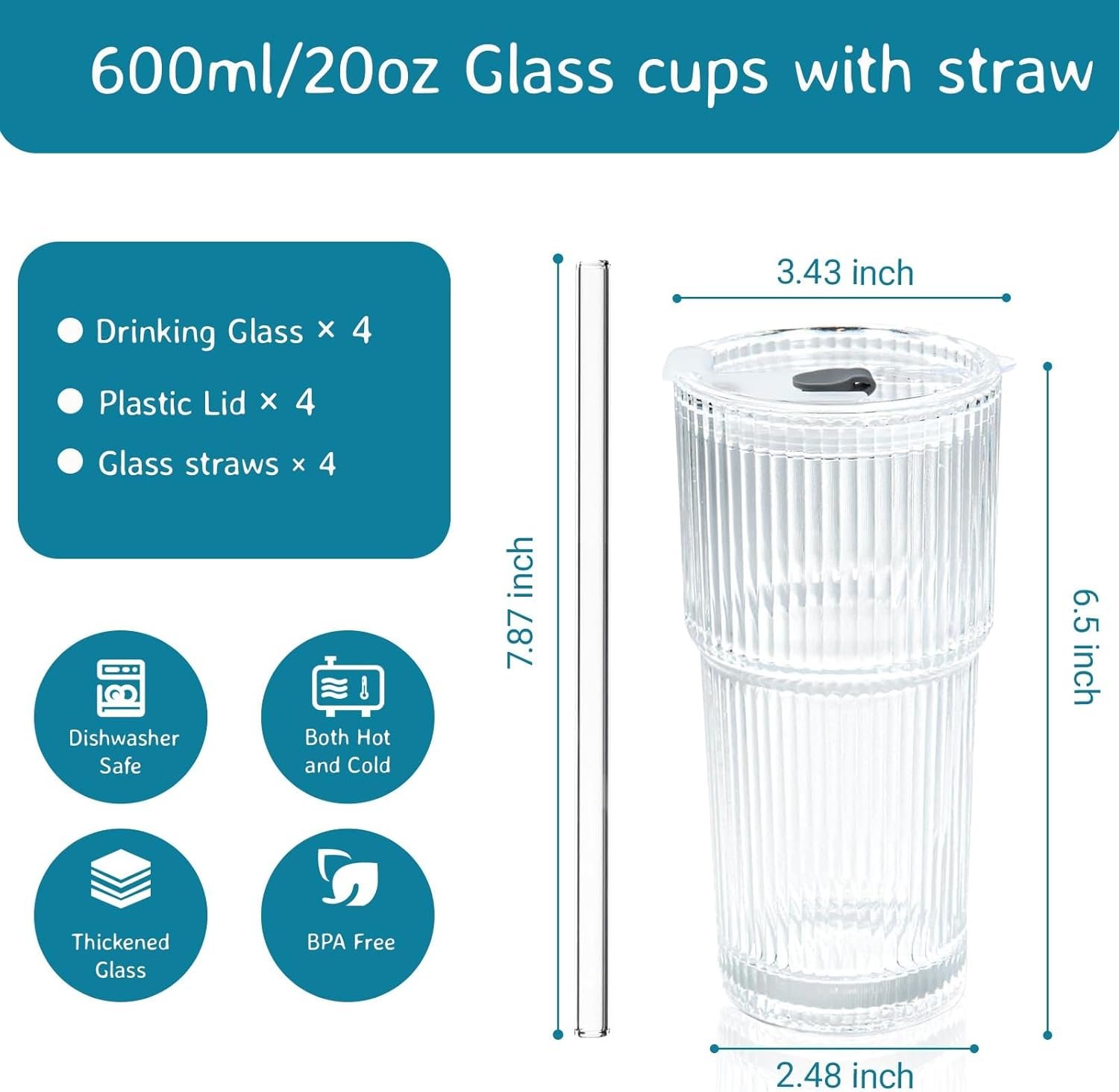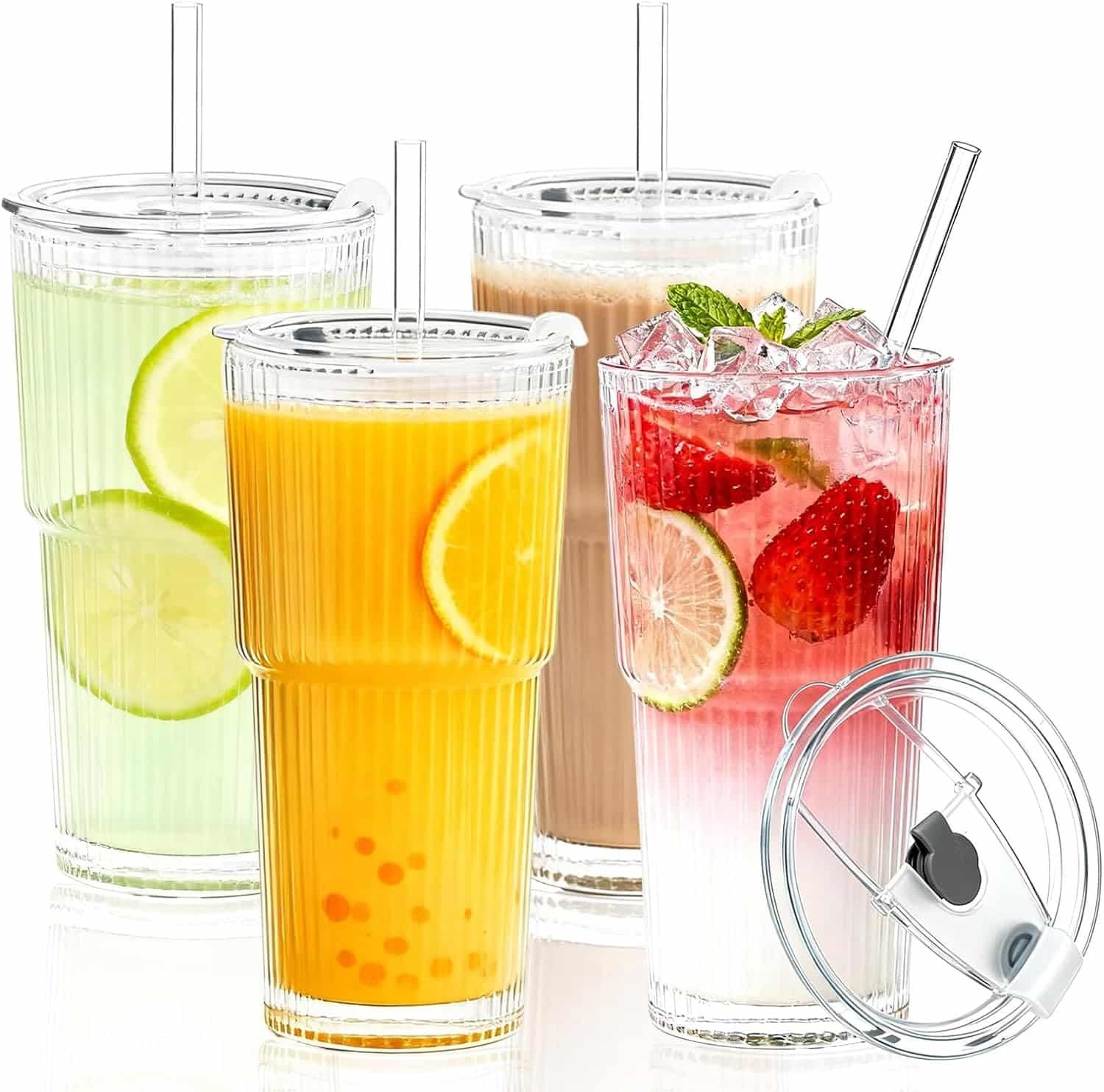 - Glass Cup Set: Includes 4 glass cups, 4 sealed plastic lids, and 4 straight glass straws. You can drink through the glass tube or the small hole at the rim of the cup, or you can drink directly from the rim without the lid. Three ways to drink freely, making it convenient for you