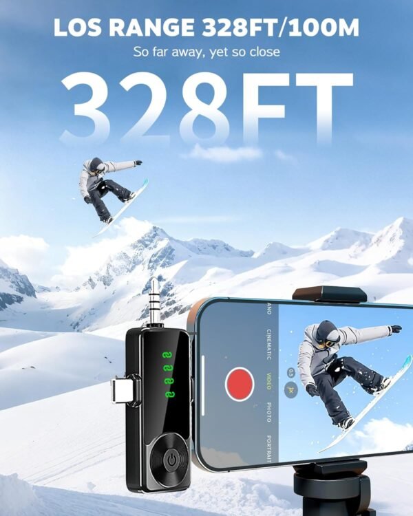 • 🔥【328ft Long-Distance Transmission】: Our professional phone mic powered by advanced 2.4G technology, providing a stable connection with a transmission range of up to 328ft (100m). This dual wireless lapel mic perfect for scenarios where you need to move freely away from your device. Enjoy ultra-low latency for synchronized audio—no lag, no glitches, just smooth recording for the best long-distance audio experience.