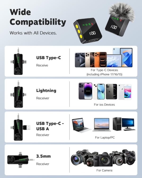 • 👍【Wide Compatibility for All Devices】: This upgraded lapel microphone with a 3-in-1 universal receiver, mic works seamlessly without switching multiple adapters or cables. The microphone for iPhone (including iPhone 15/16/17), Android smartphones, iPads, laptops, PC, cameras and more. Perfect for Vlogging, TikTok, Interviews, Live Streaming, Podcasts, YouTube and all your audio recording needs.