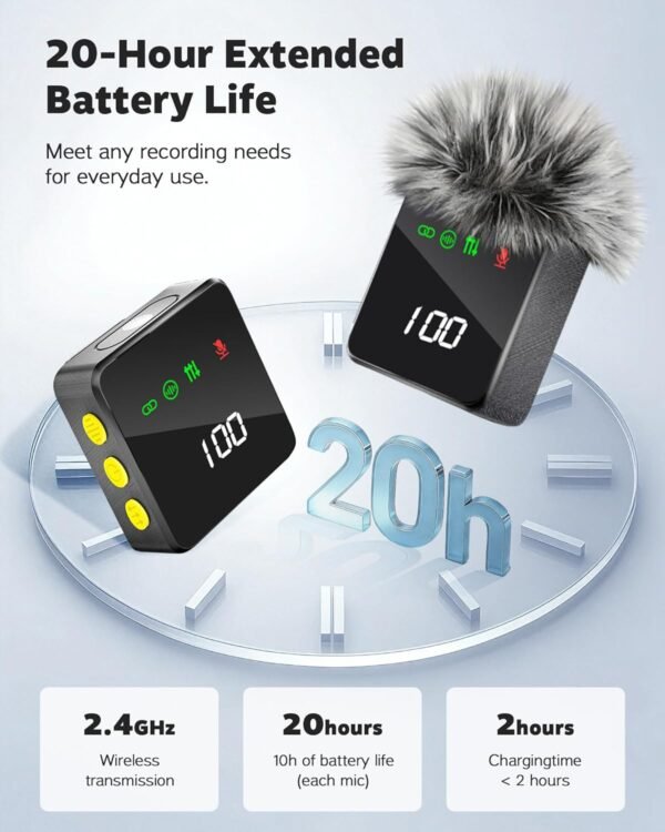 • 🔋【All-Day Battery Life】: This microphone for iPhone includes 2 small microphones with digital display, a total battery life of up to 20 hours (each mic charges fully in just 2 hours and provides 10 hours of use per charge). Additionally, you can charge your phone via the receiver's Type-C port during recording.Whether you’re live streaming for hours or shooting videos in remote areas without power access, the lav microphone lets you focus on your creativity—no more worrying about running out of battery.