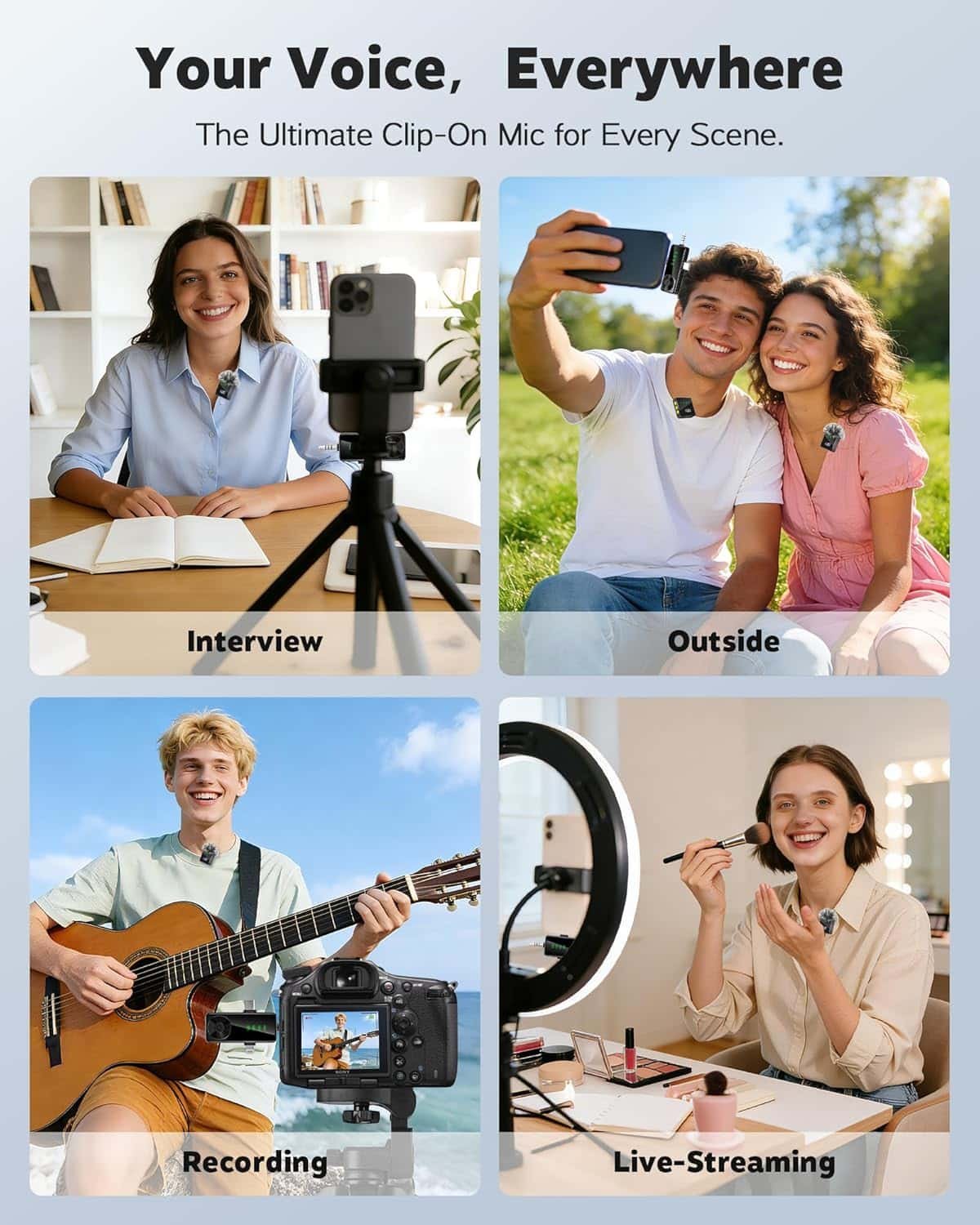 • 👍【Wide Compatibility for All Devices】: This upgraded lapel microphone with a 3-in-1 universal receiver, mic works seamlessly without switching multiple adapters or cables. The microphone for iPhone (including iPhone 15/16/17), Android smartphones, iPads, laptops, PC, cameras and more. Perfect for Vlogging, TikTok, Interviews, Live Streaming, Podcasts, YouTube and all your audio recording needs.