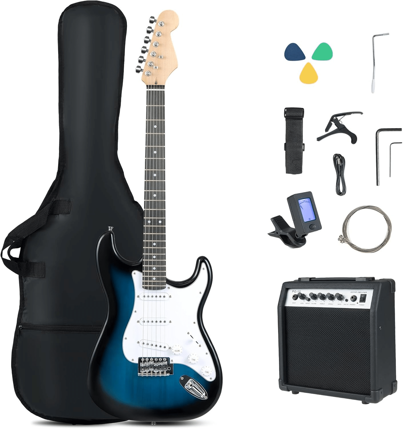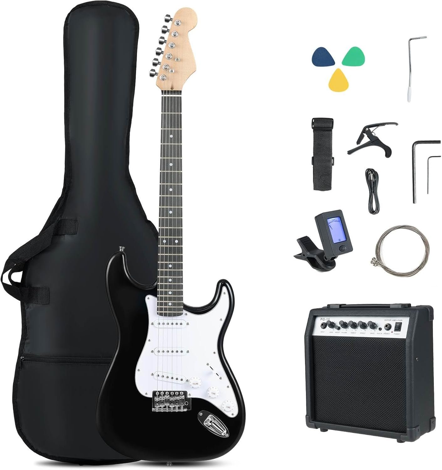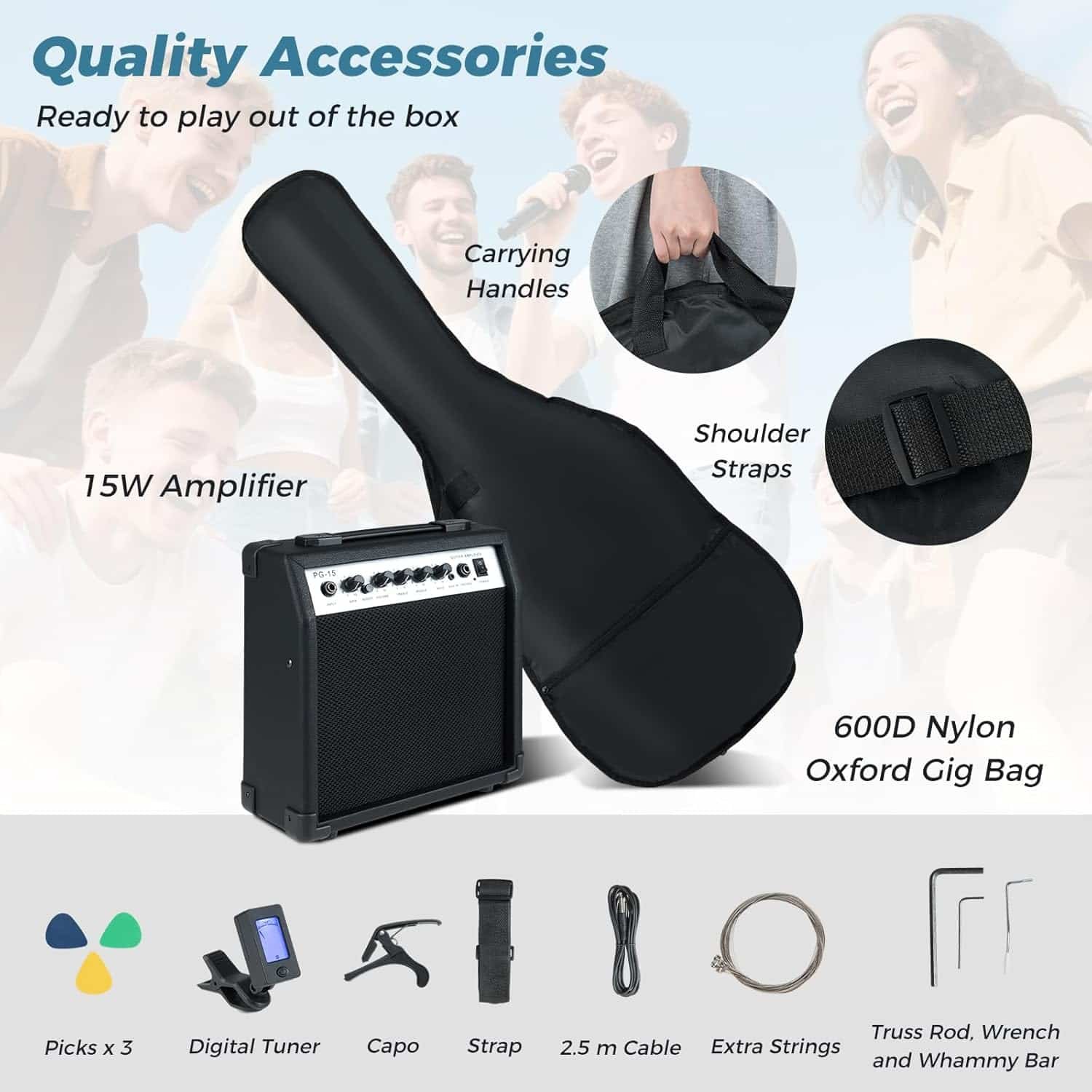 - 🎸【Ready to Play out of the Box】 This electric guitar comes with quality accessories, including a portable amplifier, 600D nylon Oxford gig bag, strap, picks, digital tuner, capo, extra strings, truss rod, wrench, whammy bar, and cable. All for a better playing and practicing experience.