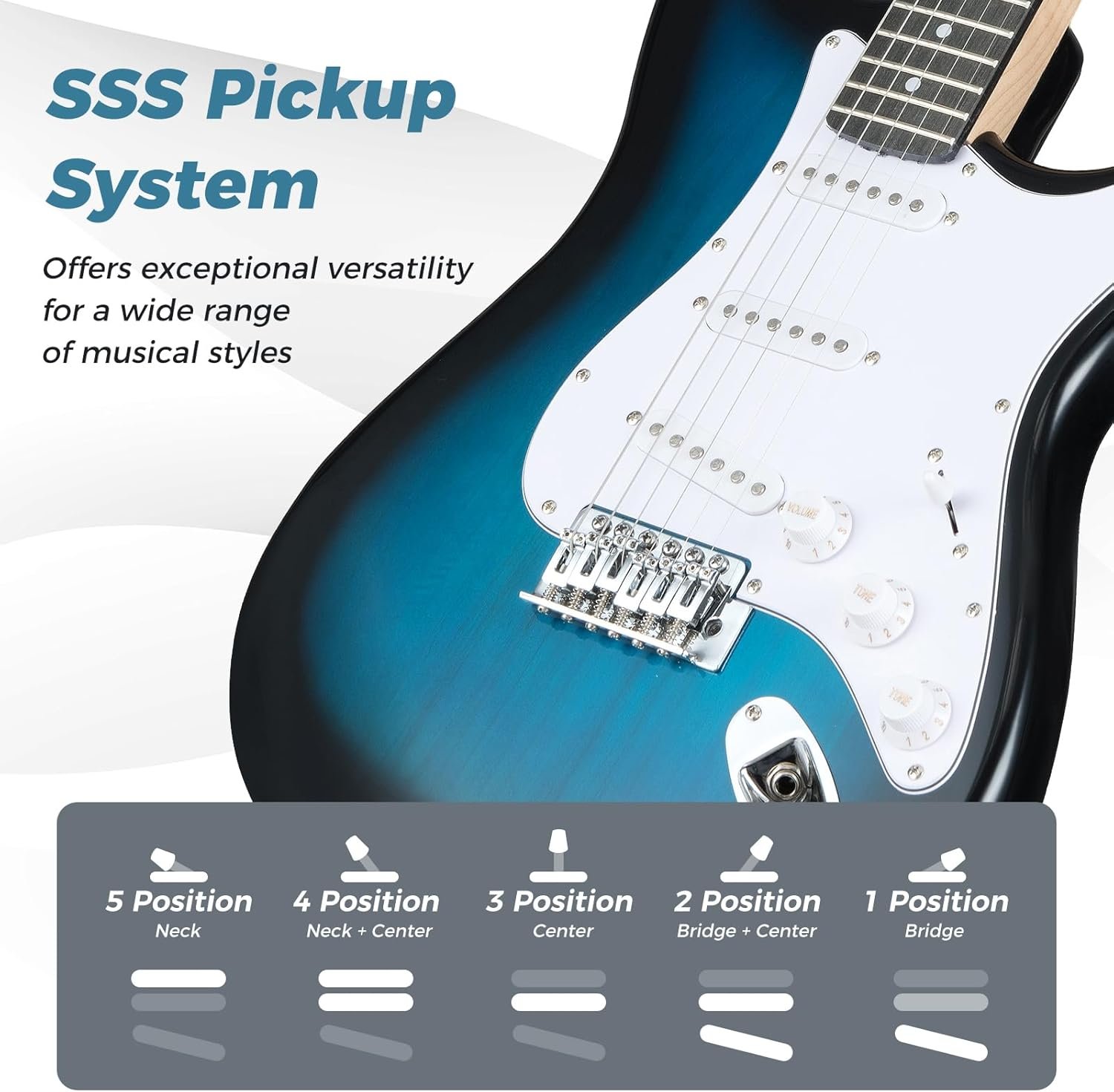 - 🎸【Classic SSS Pickup System】 The SSS pickups and 5-way switch equip you with a full range of classic tones, enhanced by 1 volume and 2 tone controls for precision shaping. Whether you crave shimmering cleans or biting leads, this electric guitar offers authentic sound.