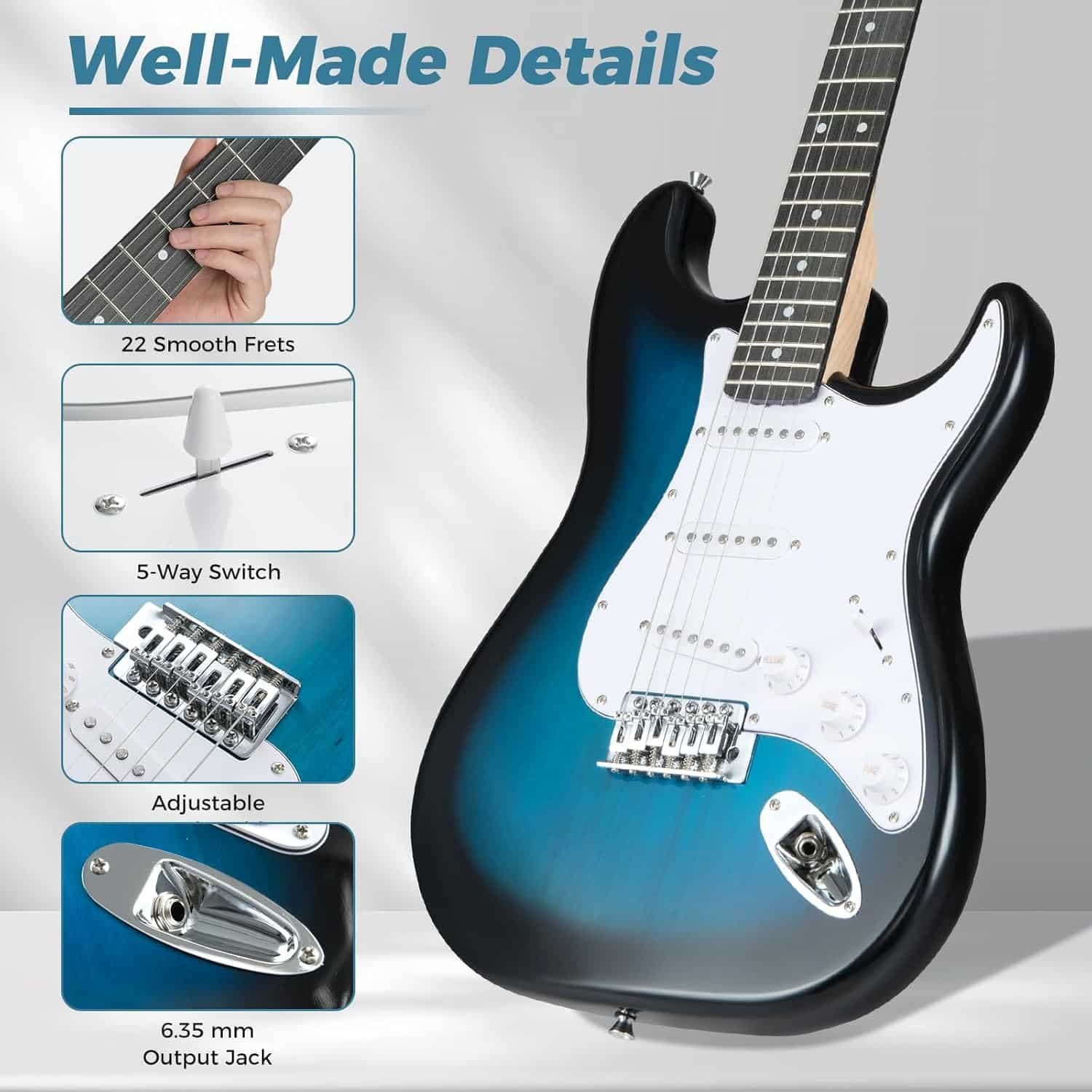 You will unlock a world of classic electric guitar tones with the SSS pickup system and 5-way switch (5 position neck, 4 position neck + center, 3 position center, 2 position bridge + center, 1 position bridge), supported by precise volume and tone controls to shape everything from clear cleans to powerful leads. Thoughtfully crafted with a lightweight poplar body, and ergonomic C-shape maple neck, this guitar offers a comfortable, sleek playing experience. Vintage-style tuning pegs provide accurate, low-noise tuning. The amplifier features headphone and aux-in jacks, supporting silent practice or jam sessions with your favorite tracks. Coming complete with a gig bag, strap, picks, tuner, capo, extra strings, tools, and cable, this guitar is ready for any player. Meanwhile, there are multiple option of amplifier: input, gain Level, volume, overdrive on/off, treble, middle, bass and power for easy operation.