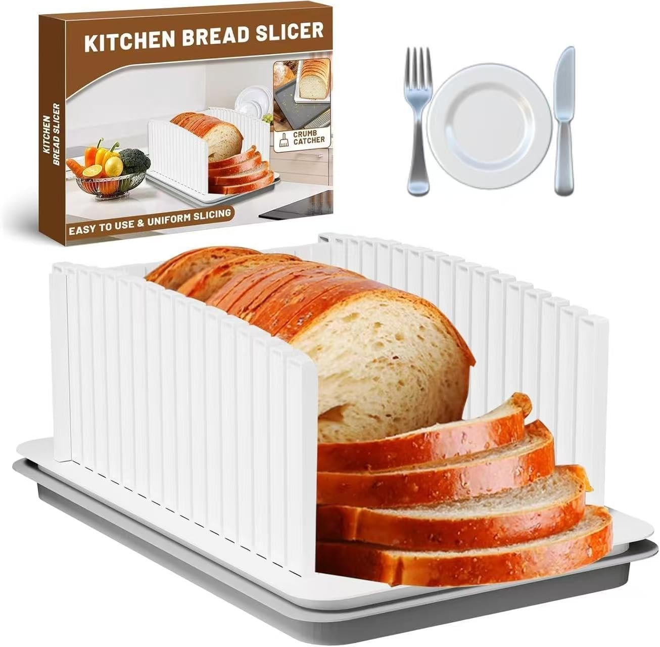Adjustable Bread Slicer with Crumb Catcher Tray, Foldable Bread Cutting Guide for Homemade Bread, Loaf Cakes, Sandwiches – Width & Thickness Adjustable, Kitchen Counter Clean Tool