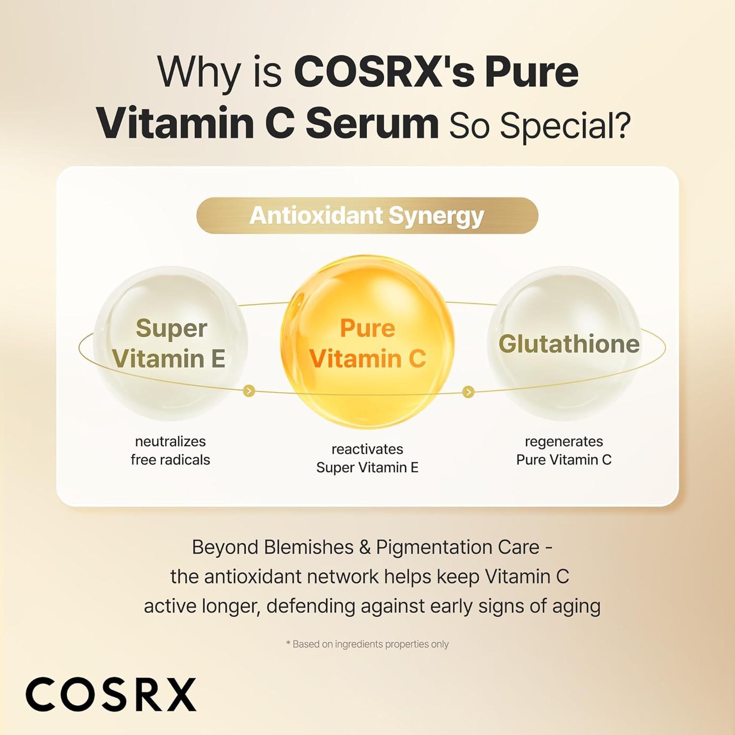 - [Antioxidant Synergy] An antioxidant network works in synergy with Vitamin C to help neutralise free radicals. Pure Vitamin C + Super Vitamin E + Glutathione.