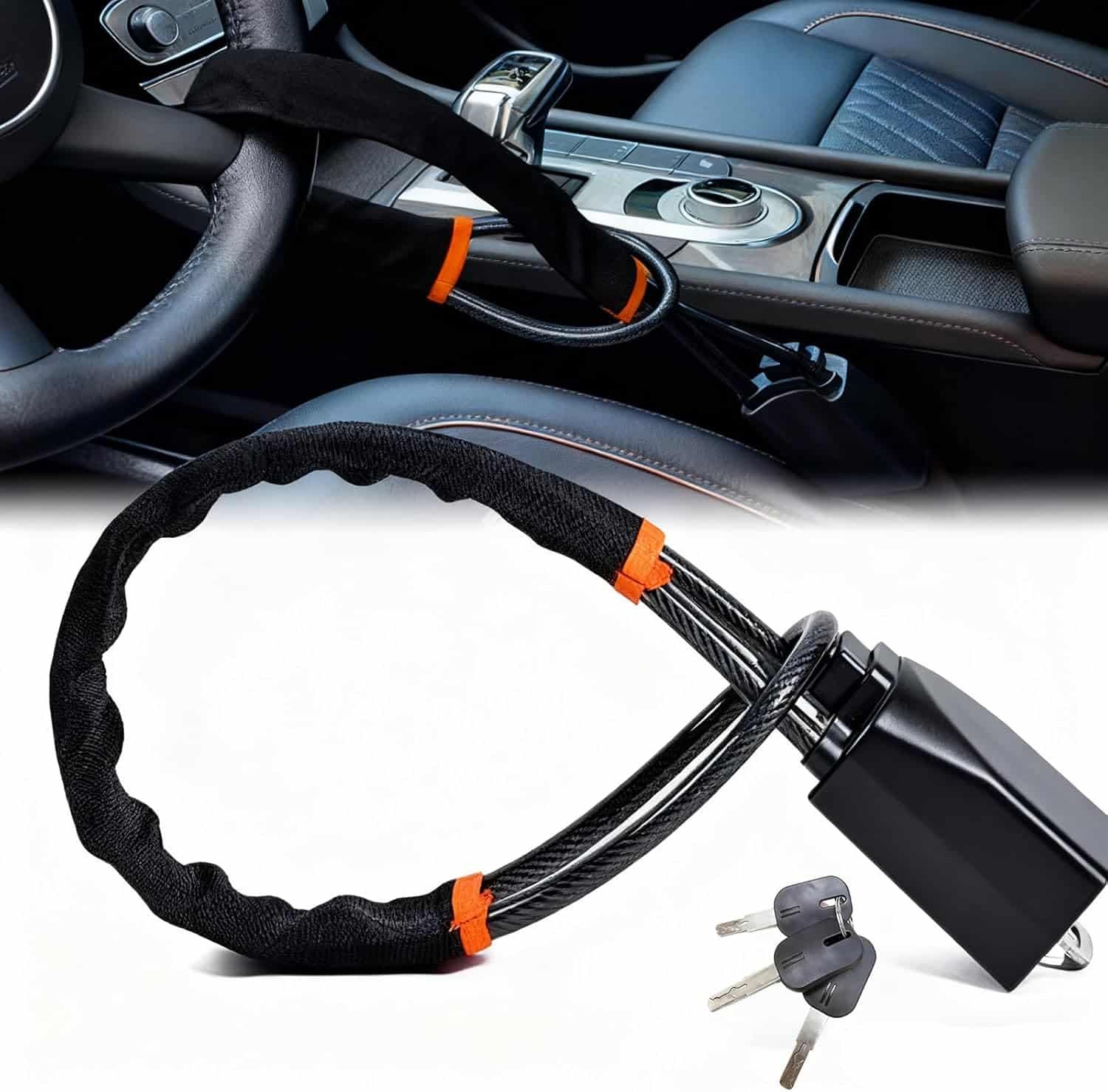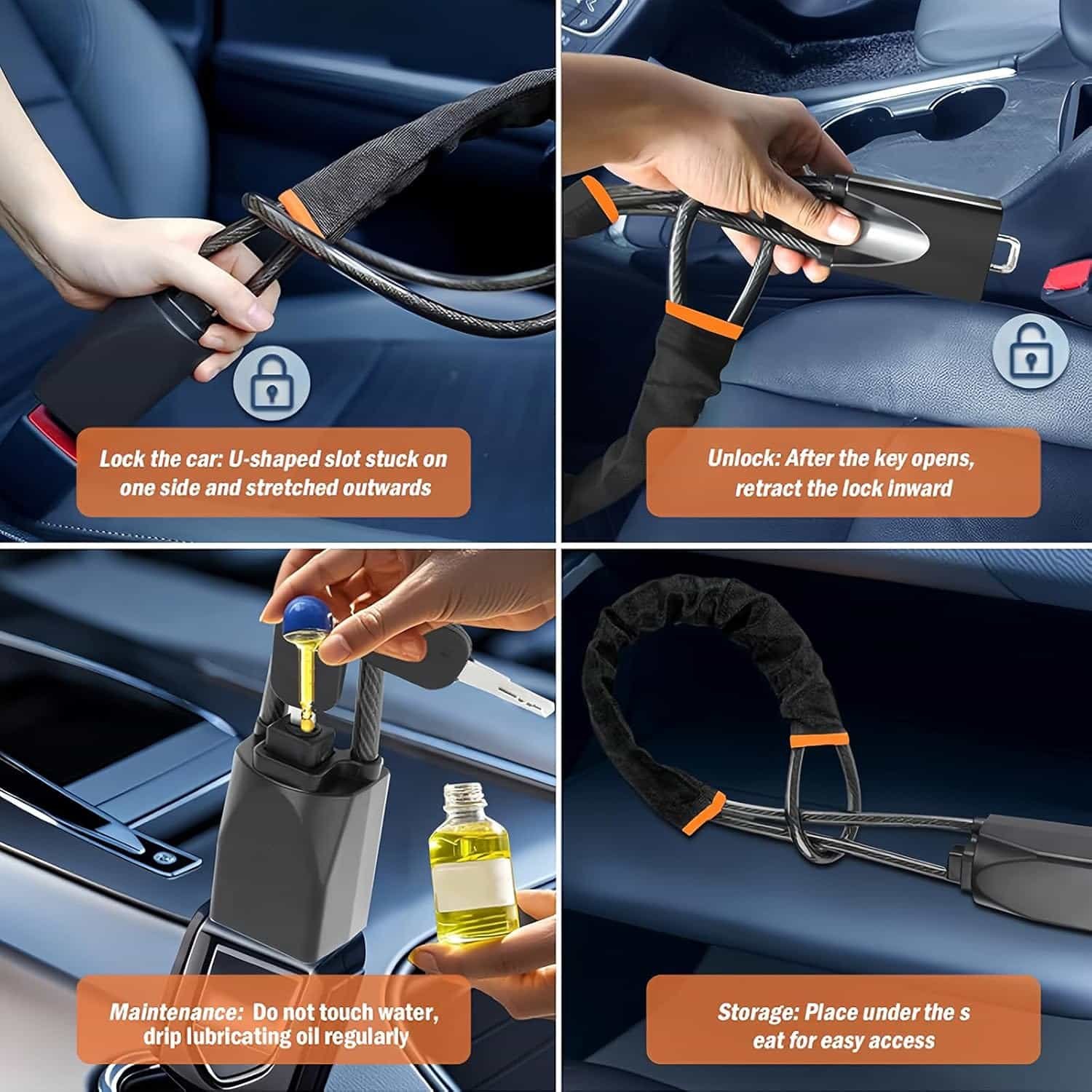 • 【Effortless to Use & Store​】No faff here—this car lock anti theft device is lightweight, compact, and sets up in seconds: simply wrap it around the steering wheel, connect it to the seatbelt port, and lock. When not in use, it rolls up neatly to tuck into your glove box, seat pocket, or door compartment—way more handy than bulky bar-type locks.​