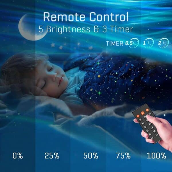 - 【Handy Remote & Auto Timer】The star projector galaxy light projector comes with a remote control, which allows you to easily control the starlight's brightness,lighting mode,timer and lighting rotation speed, whether you are sitting on the couch or lying in bed. The star projector galaxy light projector for bedroom&aurora light projector can be set to timer off at 0.5/1/2 hours. No need to worry about the star lights for the ceiling projector staying on all night when your kid is sleeping alone. Galaxy projector light for bedroom&star night light projector is very convenient, easy to control all functions.