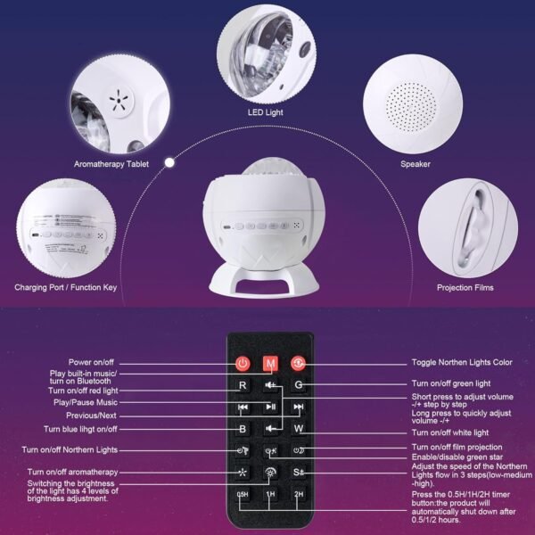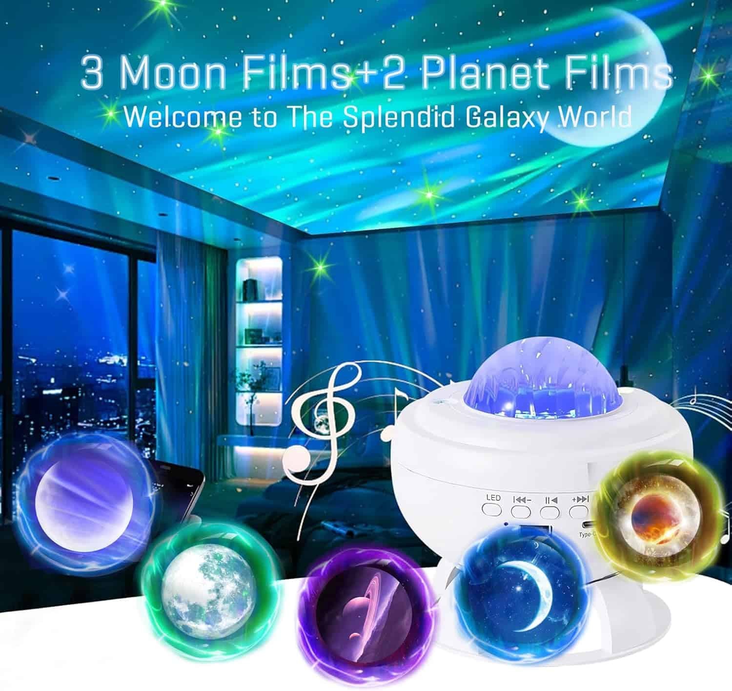- 【5 Planets Films & Star Northern Lights Projector】The star projector galaxy light projector overlays a variety of starry sky patterns with films and stars. The galaxy projector comes with 5 films(3 moons and 2 Saturn systems). Embrace the magic of the cosmos right in the comfort of your home with our extraordinary aurora light projector.