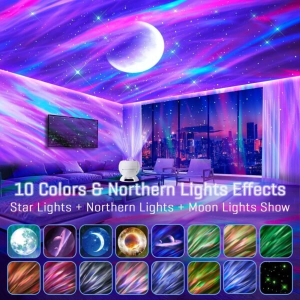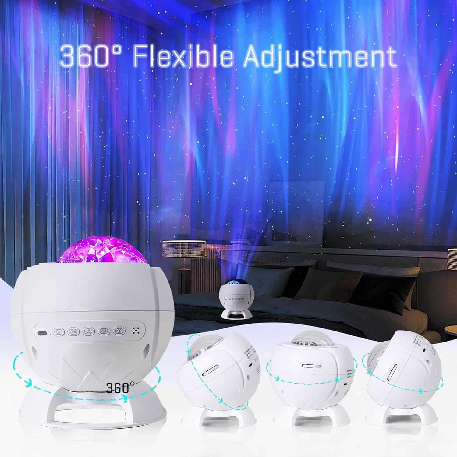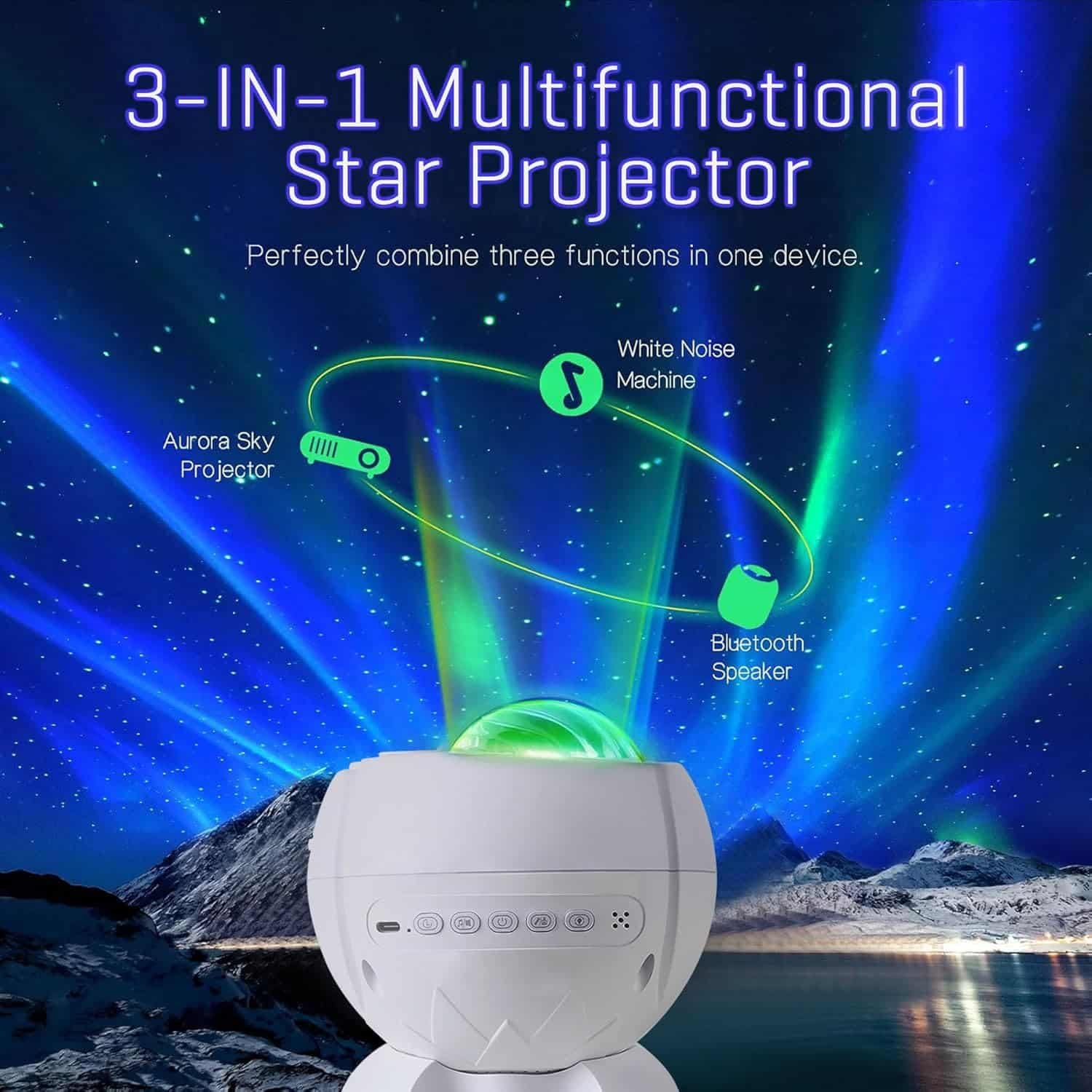 - 【3 in 1 Aurora Light Projector】 Star projector galaxy light projector galaxy projector for bedroom boasts 3 projection lenses, capable of projecting northern lights & stars & moons, providing 360 lighting effects northern light&star lights&moon lights to create a relaxing atmosphere with soothing music, bringing you to enjoy the beauty of nature. You can have both northern lights and stars working in unison or independently according to your preference. They can be displayed by separation or combination, they can be static or moving, fast or slow, creating a miraculous ambience in your room.