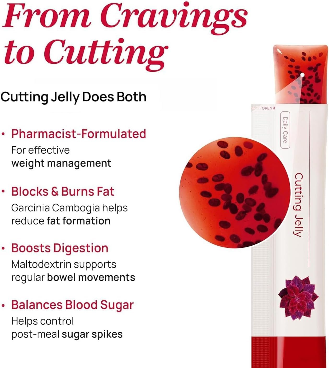 • 【Appetite Control & Craving Management】Formulated with Garcinia Cambogia Extract (HCA), this Garcinia Cambogia Cutting Jelly helps support appetite control and reduce cravings. A convenient and tasty way to complement your wellness routine and maintain your weight goals naturally.