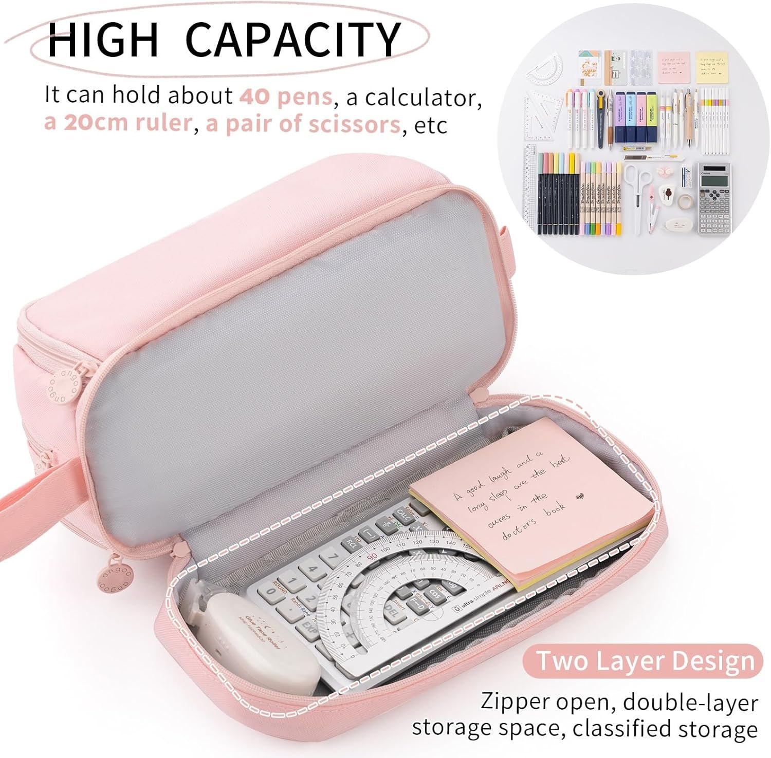 Unzip the bottom zipper, you can put your calculators or small journal on this level.