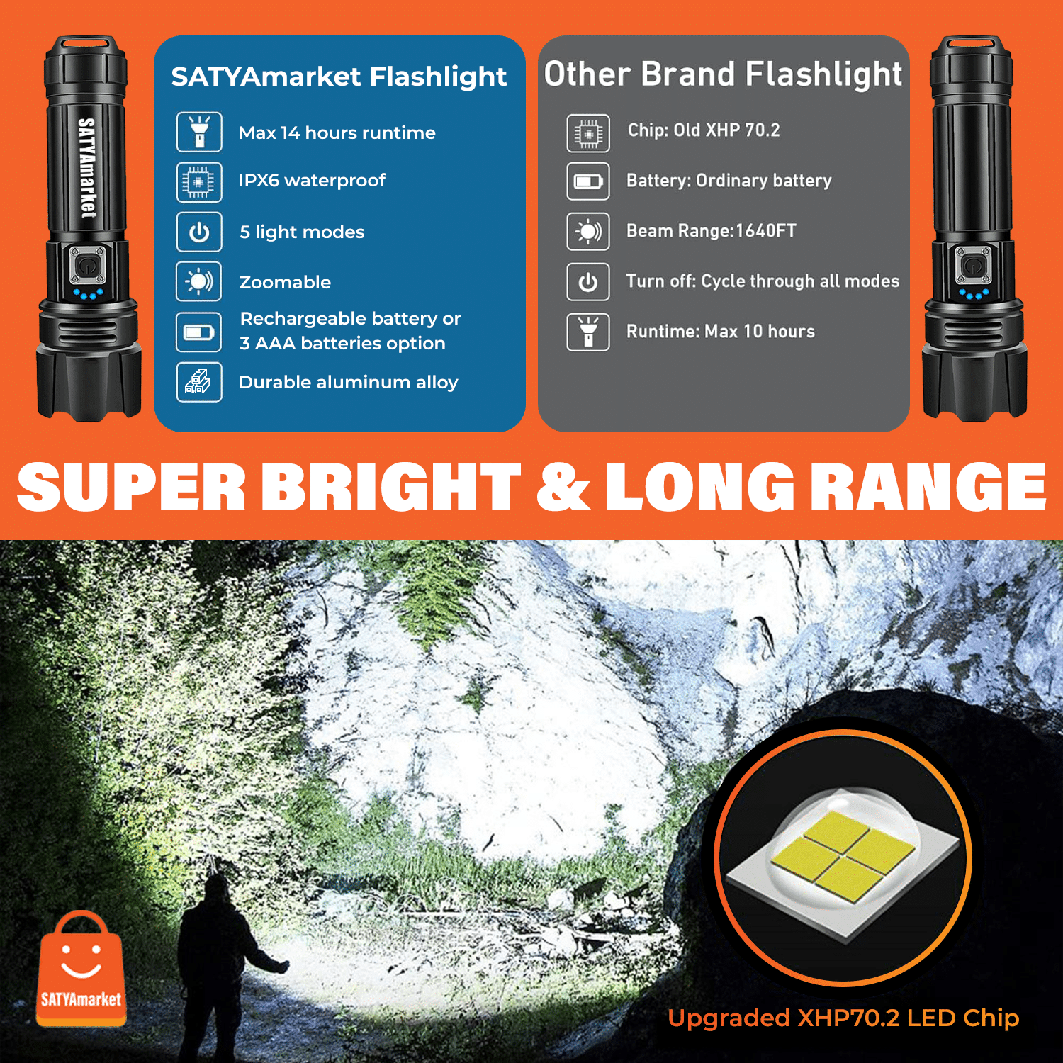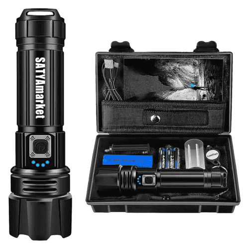 Experience unmatched brightness with the SATYAmarket LED Tactical Flashlight, designed for professionals, adventurers, and emergency preparedness. Emitting up to 90000 lumens, this flashlight can pierce through total darkness with ease. The telescopic zoom function lets you switch from a wide-area floodlight to a focused beam, perfect for searching or long-distance visibility.