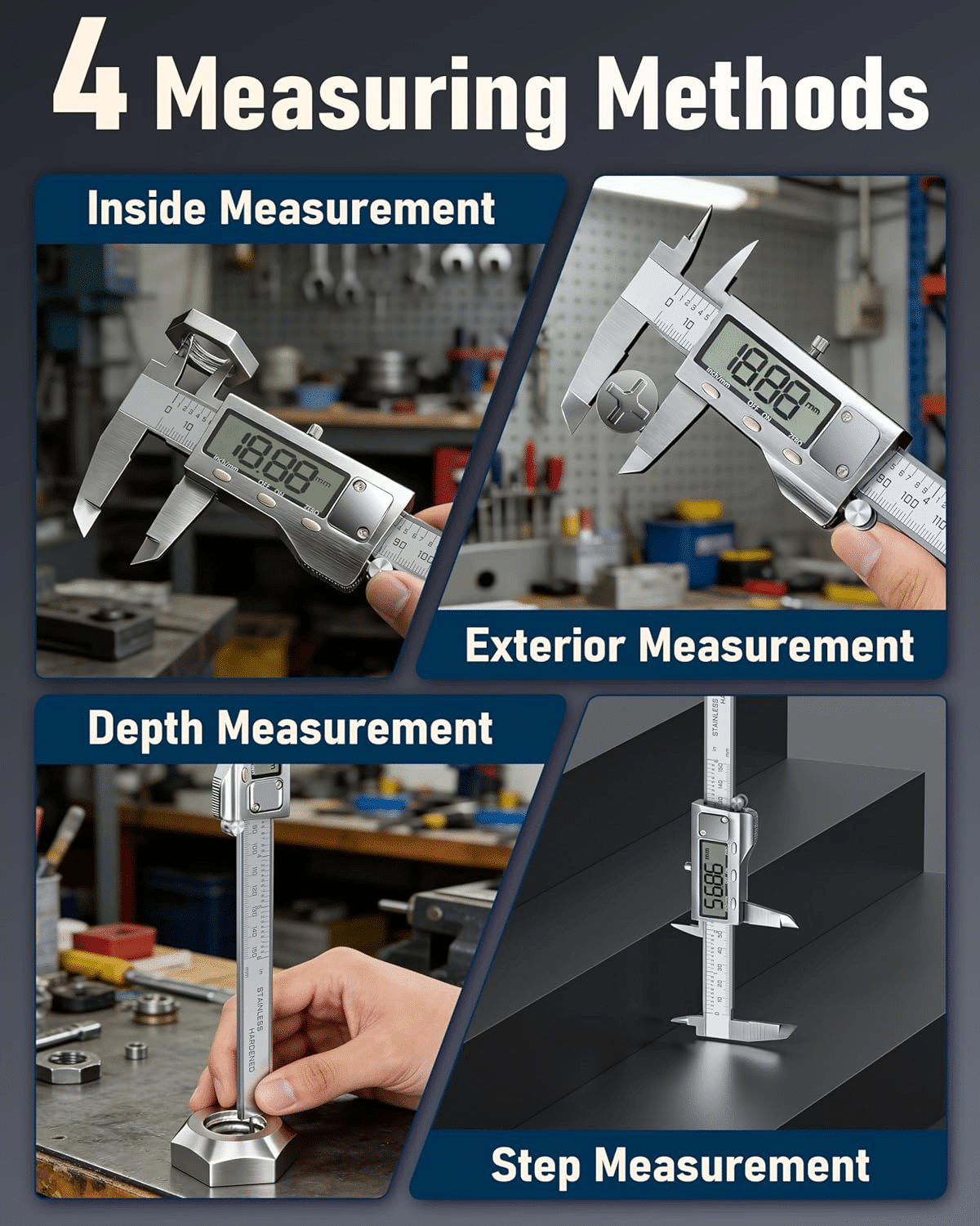 - 【4 Measuring Ways】 Caliper measuring tool comes with two sets of jaws and a probe, which are easy to measure depth, step, external and internal diameter, making all your objects measurable.