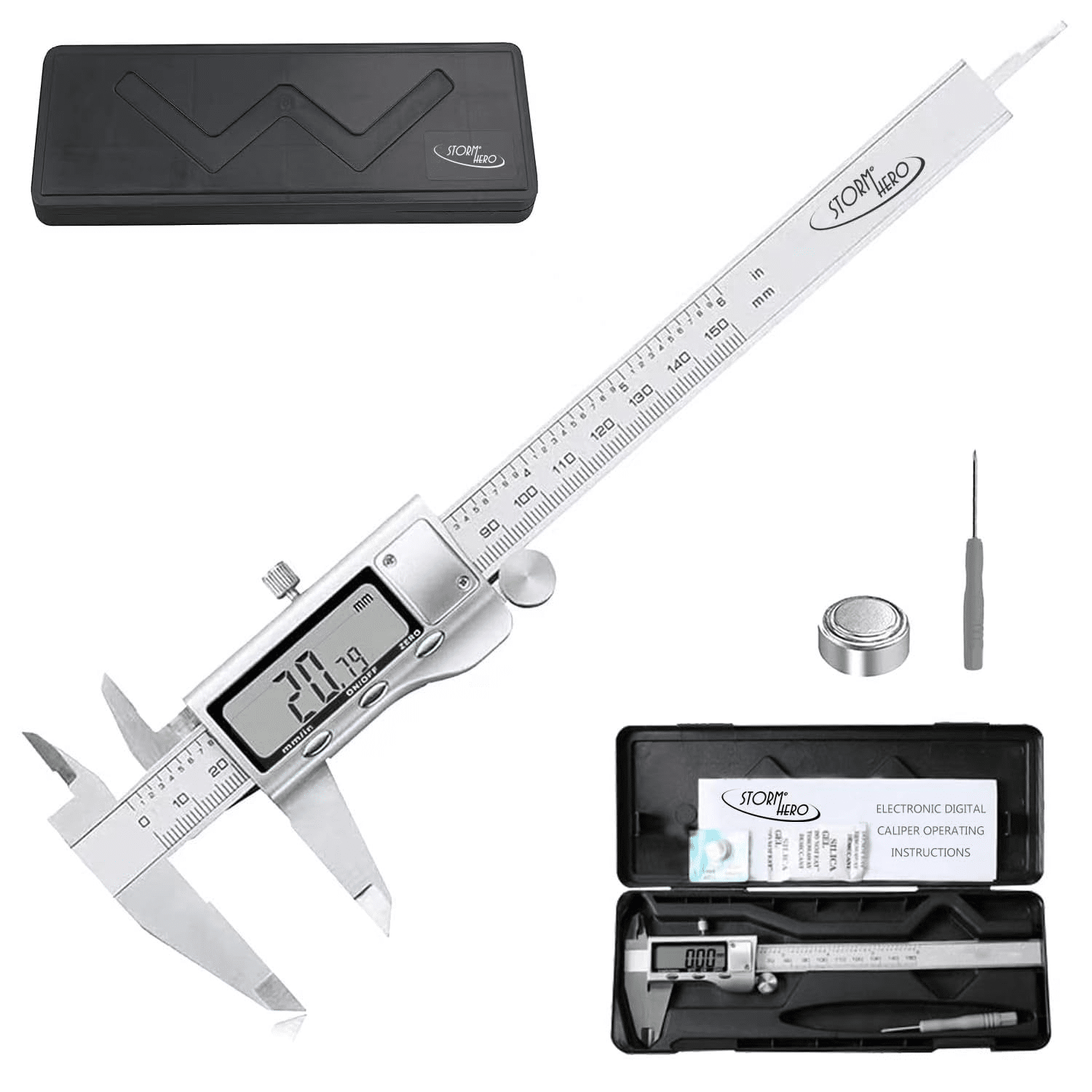 - 【WHAT YOU GET】 Storm HeroDigital Vernier Caliper, User Manual,1.5V Battery and two feeler gauge for measuring the depth of the gap.