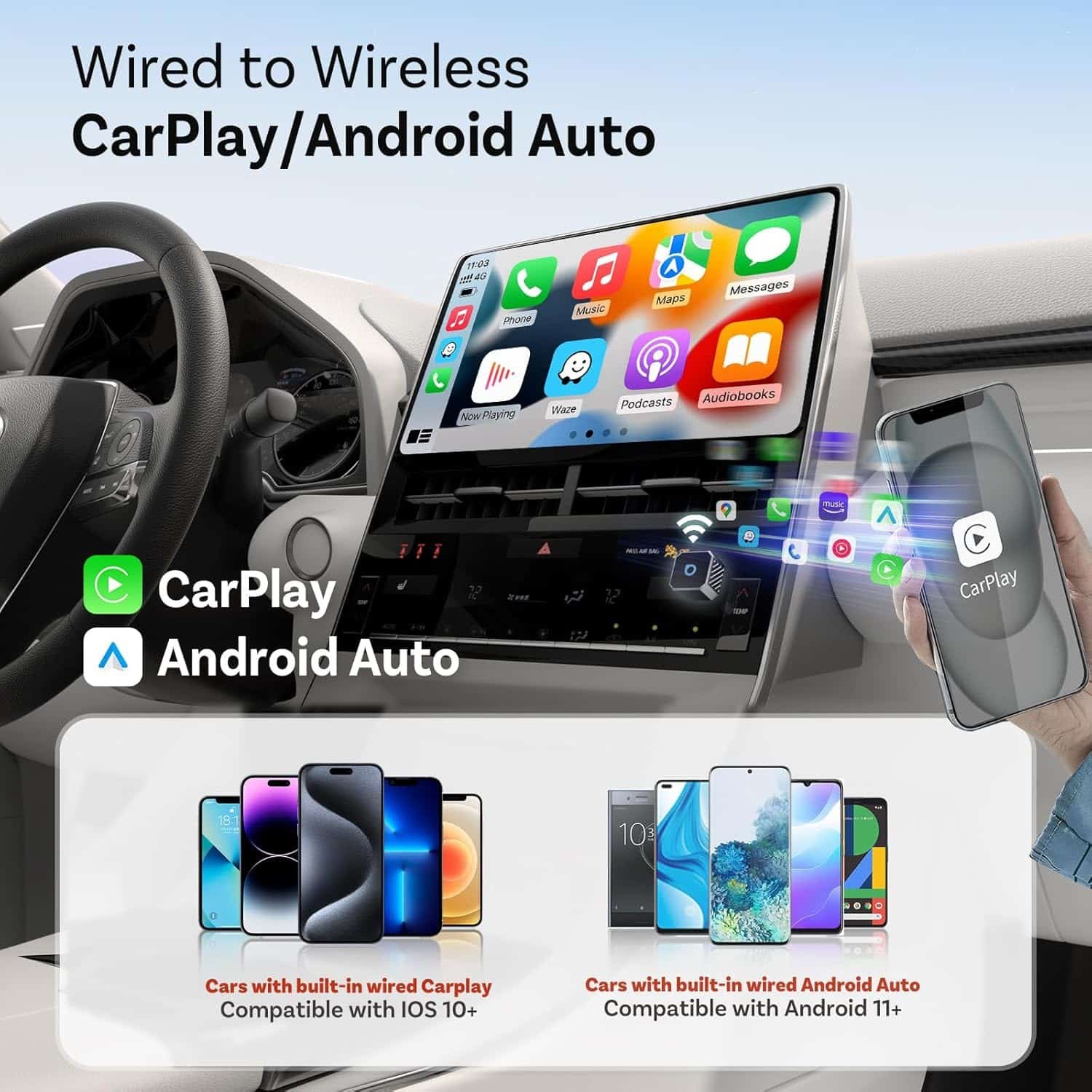 【Wide Compatibility, Easy to Use】:Works with most cars (2016+) with wired CarPlay or Android Auto, and supports iPhone (iOS 10+) and Android phones (Android 11+ with 5GHz WiFi). Keeps your original car controls exactly the same.(Whether using touchscreen or steering wheel buttons, everything feels familiar—no new learning curve needed.)