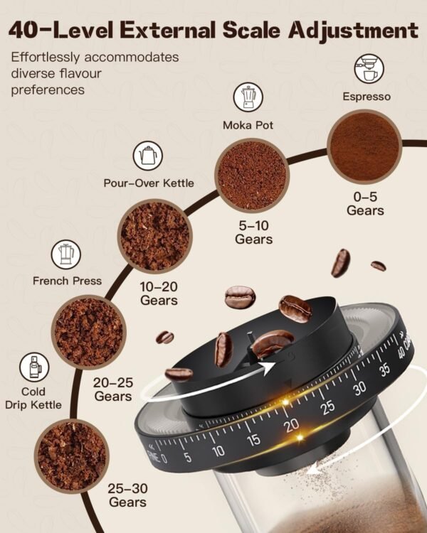 - 𝐀𝐝𝐣𝐮𝐬𝐭𝐚𝐛𝐥𝐞 𝐆𝐫𝐢𝐧𝐝 𝐒𝐞𝐭𝐭𝐢𝐧𝐠 Dial from fine to coarse (higher = coarser) with the clear 40-step scale to match espresso, filter, or French press styles.