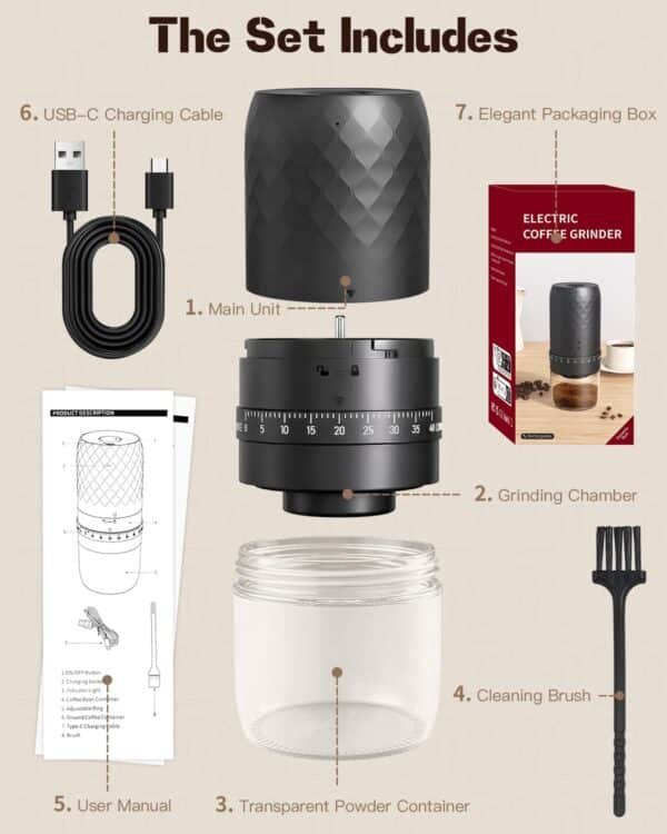 - 𝟏𝟖𝟎𝟎𝐦𝐀𝐡 𝐋𝐚𝐫𝐠𝐞-𝐂𝐚𝐩𝐚𝐜𝐢𝐭𝐲 𝐁𝐚𝐭𝐭𝐞𝐫𝐲 The high-capacity battery delivers extended runtime, capable of grinding up to 30 cups of coffee on a single charge.