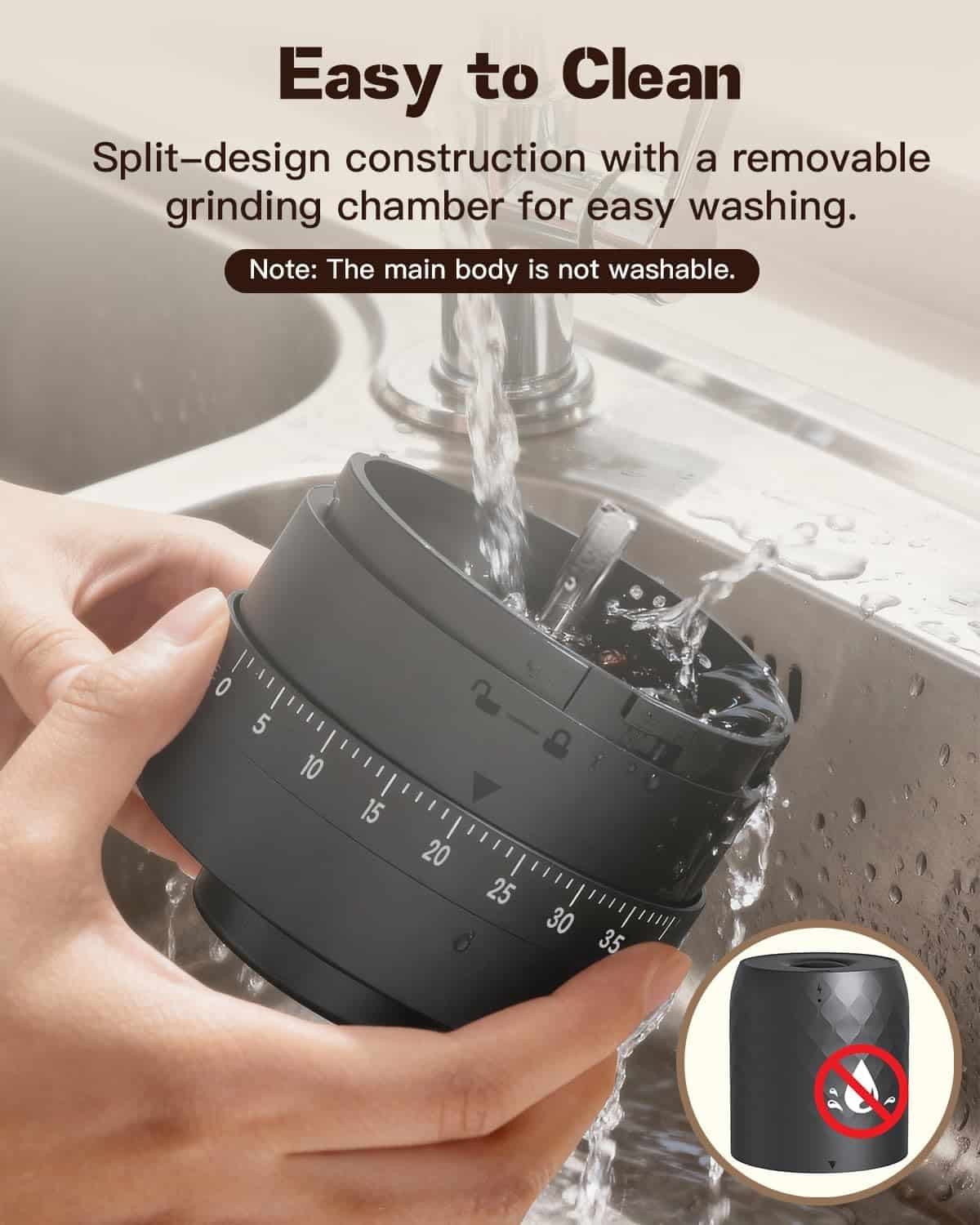 - 𝐄𝐚𝐬𝐲 𝐂𝐥𝐞𝐚𝐧𝐢𝐧𝐠 𝐃𝐞𝐬𝐢𝐠𝐧 Split design with a detachable, washable grinding chamber makes maintenance fuss-free after camping or daily use.