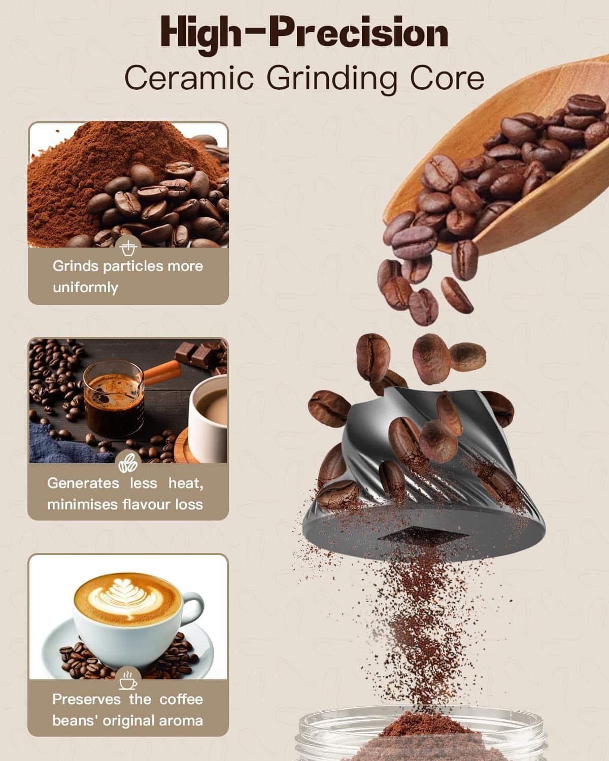 - 𝐆𝐫𝐢𝐧𝐝 𝐌𝐨𝐫𝐞 𝐄𝐯𝐞𝐧𝐥𝐲 The ceramic grinding core produces a more even grind that preserves the original aroma of your coffee beans, resulting in a cleaner, fuller cup every time.
