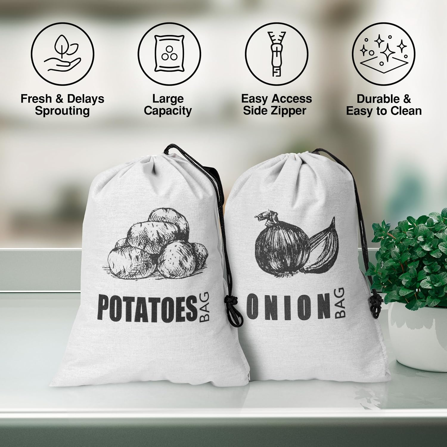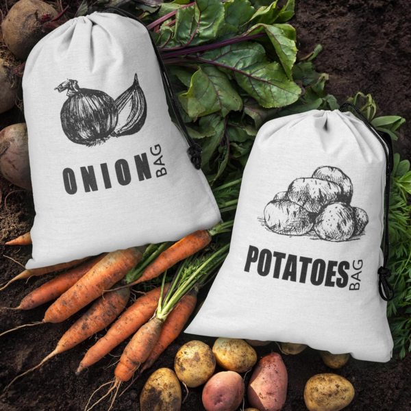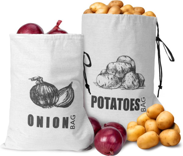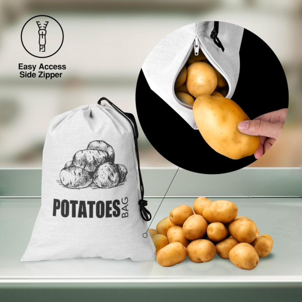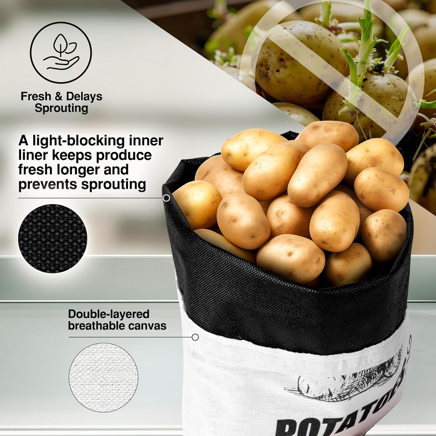 - Keeps Potatoes Fresh & Delays Sprouting Designed with a light-blocking inner liner, this potato and onion storage bag blocks out light to help slow sprouting and extend the freshness of potatoes and other root vegetables such as onions, garlic, and sweet potatoes.
