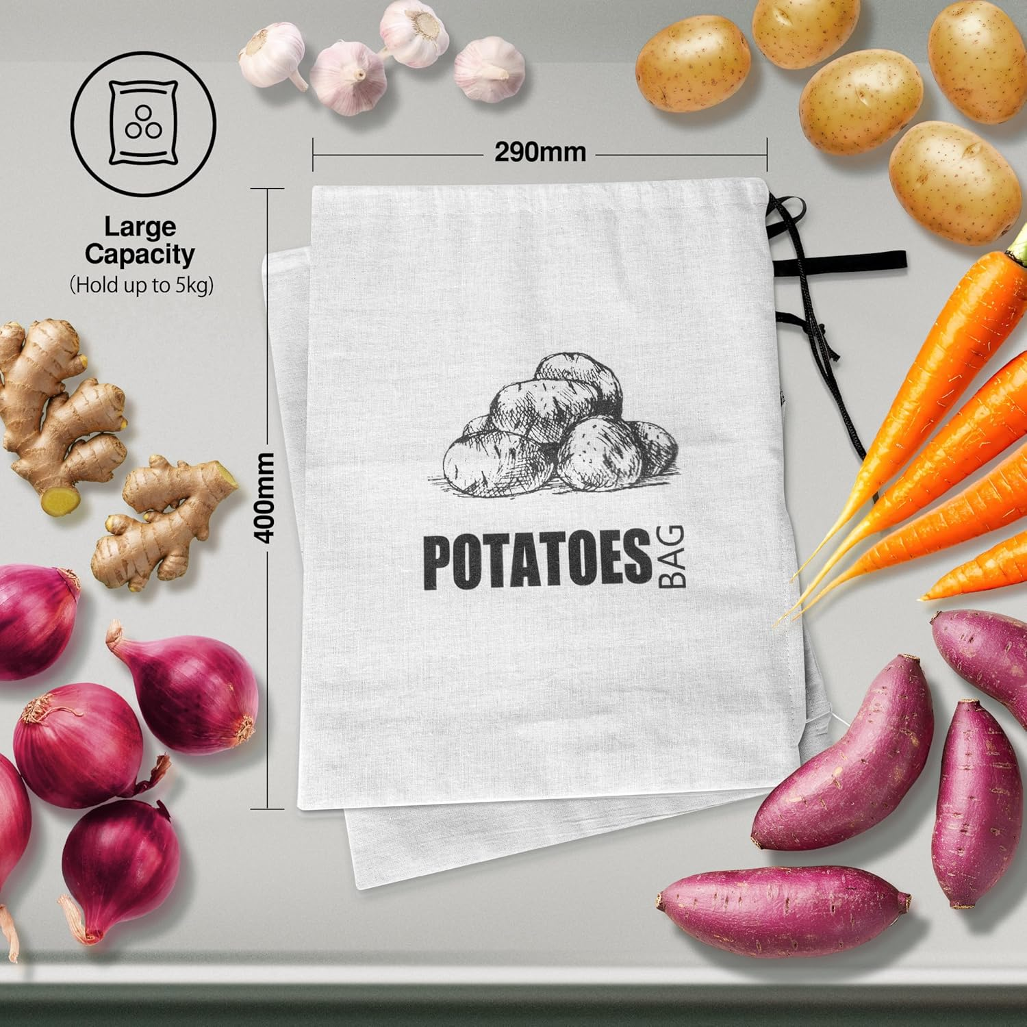 The spacious storage bag holds up to 5 kg of vegetables, making it ideal for households that buy in bulk. Size: 29 cm (W) x 40.6 cm (H)—perfect for pantry shelves or countertops without taking up too much space.