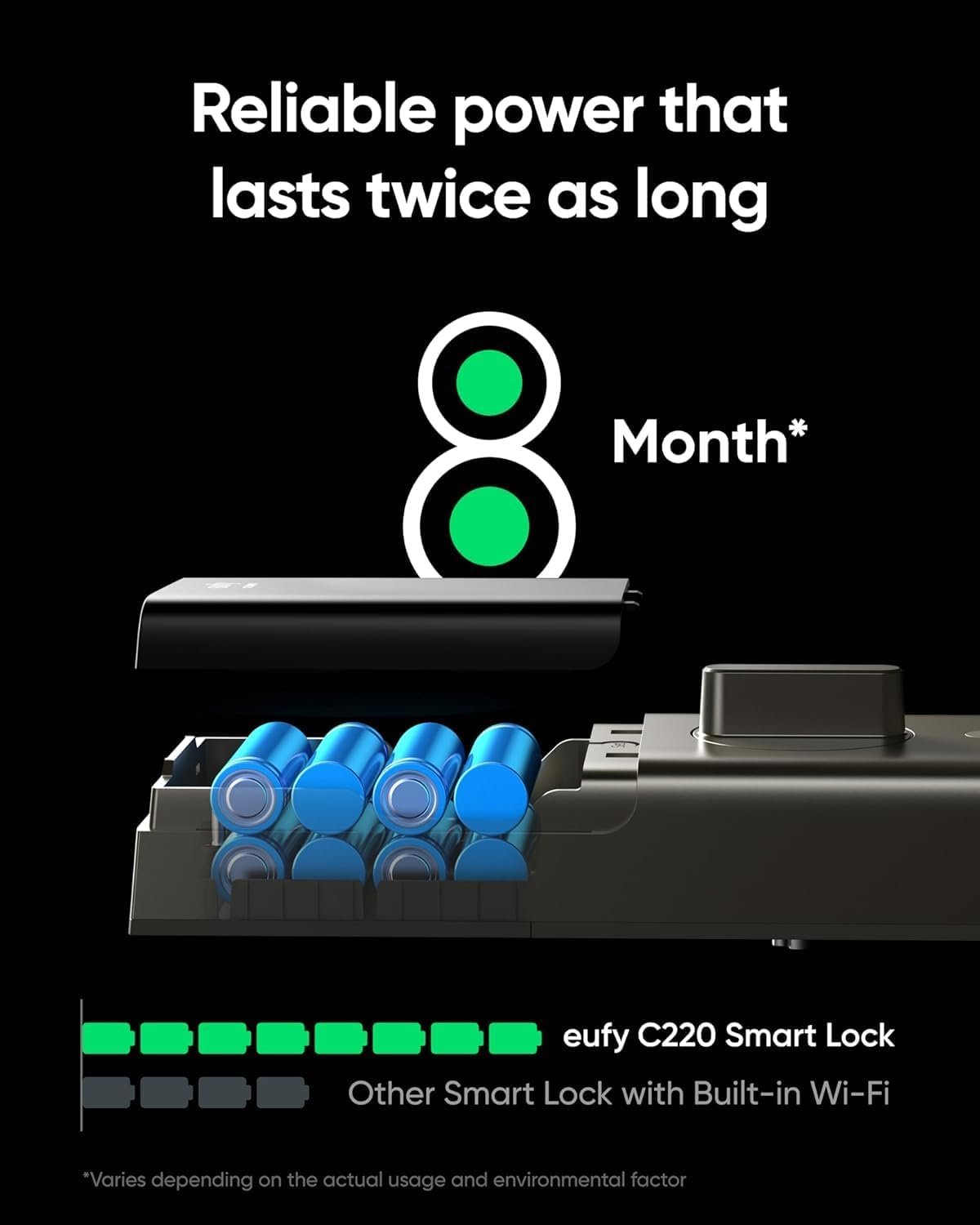 - 8 Months Battery Life: With 8 AA batteries, Smart Lock C220 runs around 8 months. Experience ultimate convenience and peace of mind with our long-lasting power solution. *May vary depending on the frequency of the lock being used.