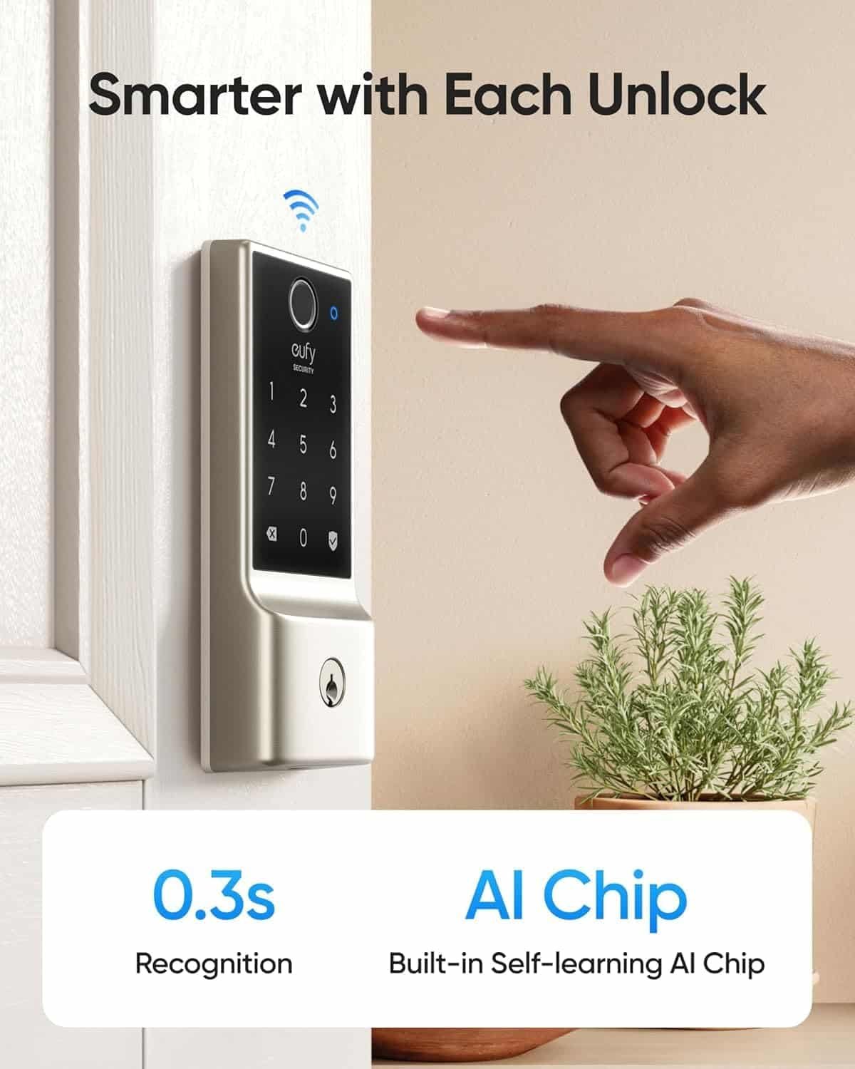 - Self-learning AI: Fingerprint door lock recognition gets more precise with every touch, so you don’t have to try agian and again to get in. Never be awkward or upset at unlocking the door. 【6 Ways to Unlock】Unlock with a touch for less than 1.5s with fingerprint lock. You can also open your front door lock via the eufy Security app, using the keypad or physical key, from Apple Watch, or use your voice with Alexa/Google Voice Assistant.