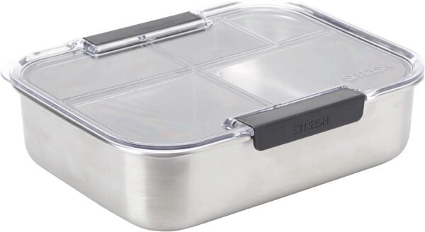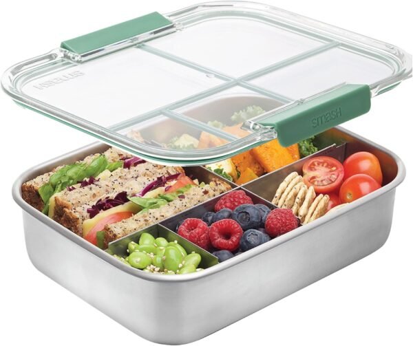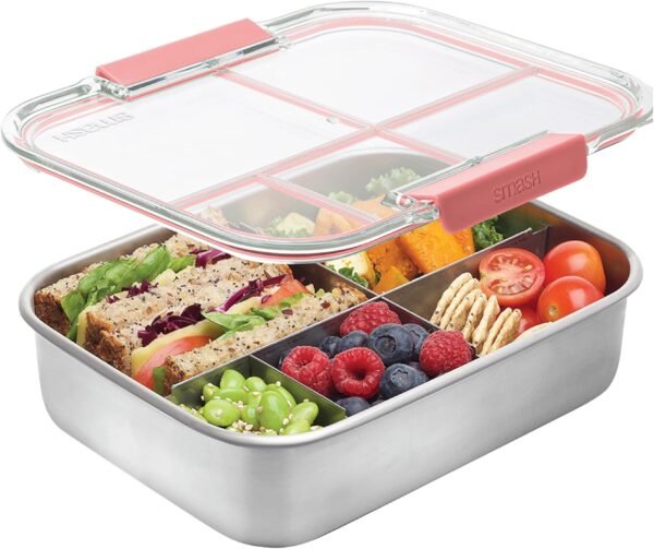 • AIR TIGHT AND LEAK-PROOF- won't leak into your bag. The 5 compartments separates your different foods but it will not prevent liquids from mixing within the box. Smash Stainless Steel mini pots fit inside this bento and provide a leak-proof solution for transporting dressing and sauces within this bento.