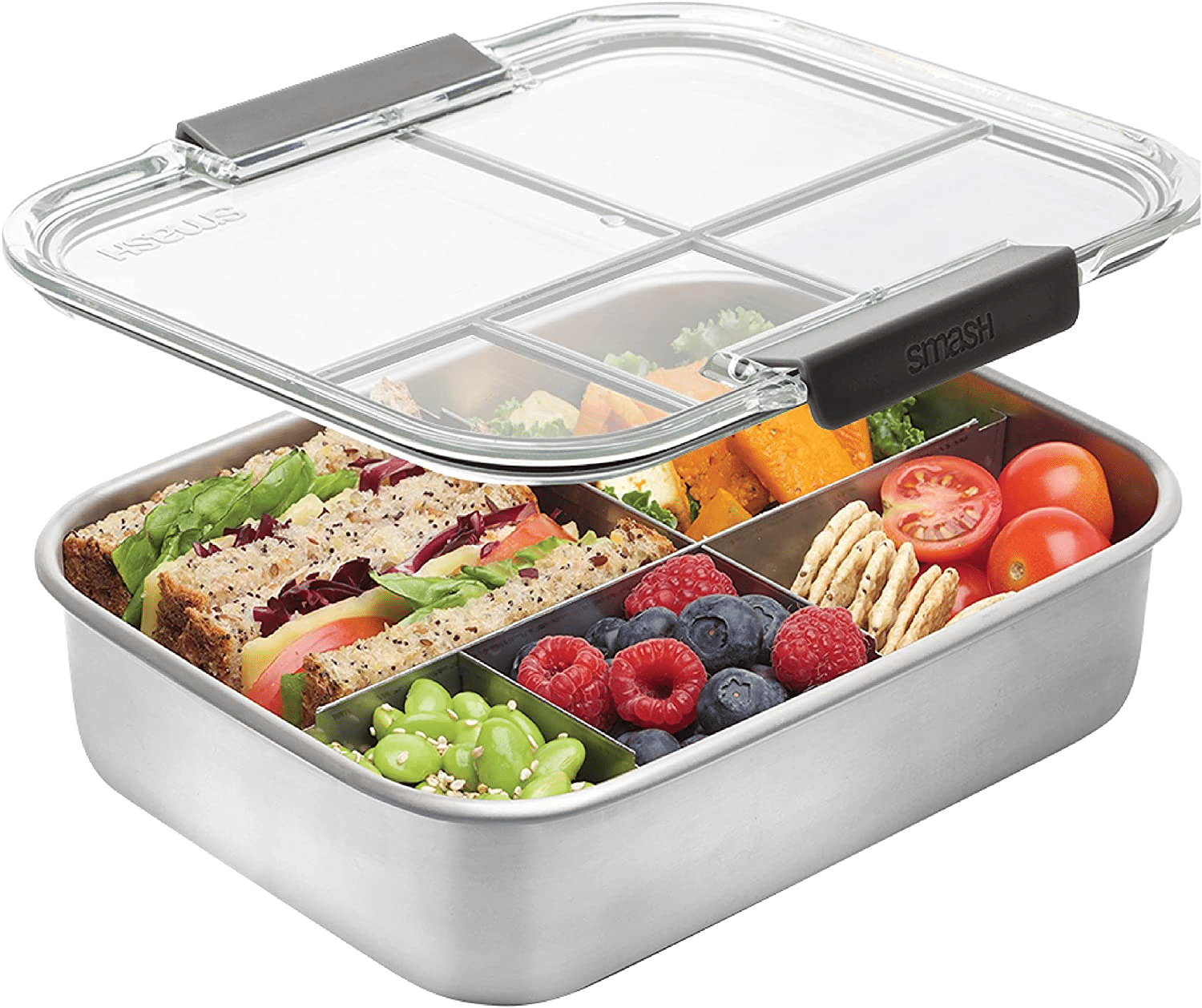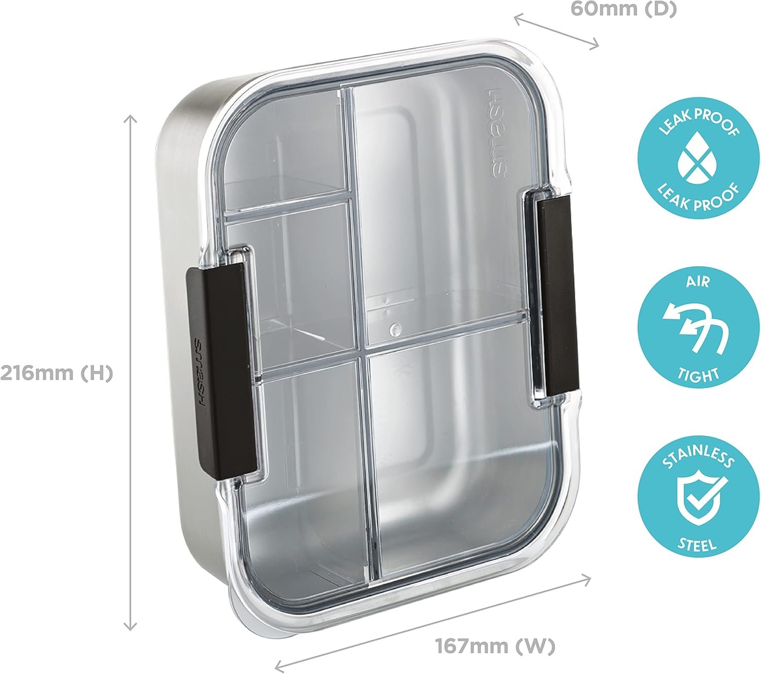 • AIR TIGHT AND LEAK-PROOF- won't leak into your bag. The 5 compartments separates your different foods but it will not prevent liquids from mixing within the box. Smash Stainless Steel mini pots fit inside this bento and provide a leak-proof solution for transporting dressing and sauces within this bento.