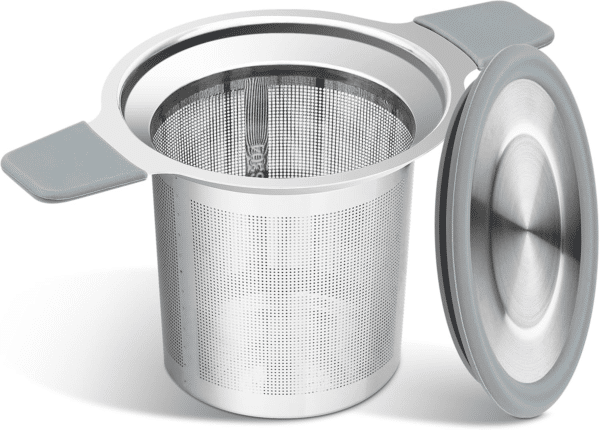 The lid of the tea strainer for loose tea keeps the steeping goodness from evaporating and keeps water warm, resulting in less mess.