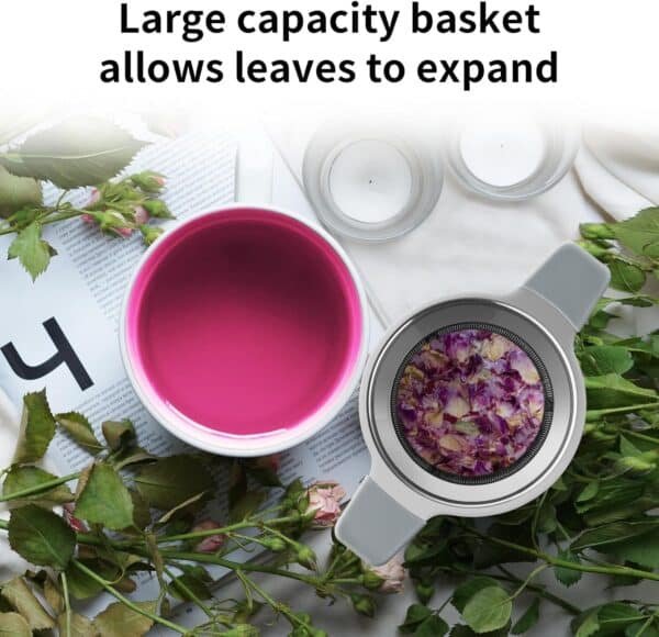 AIDERLY 304 stainless steel fine mesh tea infuser has double handles with silicone for easy handling. The tea diffuser is the perfect size and has a large capacity to hang on teapots, mugs, cups, and infuse loose leaf tea, coffee, and other beverages.