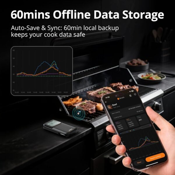 [WiFi 5G+Bluetooth 5.4 Dual Connection] This wireless BBQ thermometer features dual-band 5G and 2.4G WiFi connectivity and Bluetooth 5.4 for seamless monitoring. At home, you can effortlessly monitor your kitchen work from an ultra-long Bluetooth distance of 305 m/1000 ft. Outdoors, it automatically switches to a WiFi connection, so you won't miss a thing