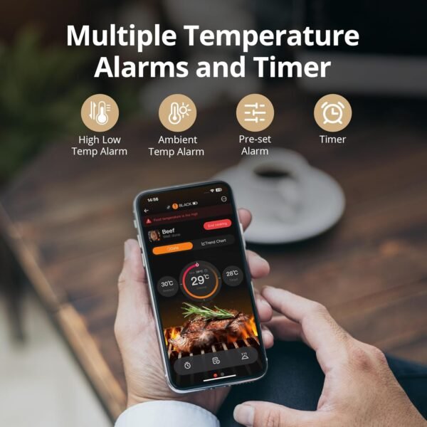 [High and Low Food/Oven Temp Alarms] The smart app offers 28 USDA-recommended meat menu options and features real-time high and low food temperature alarms, as well as high and low oven temperature alarms and other reminder functions, to help you avoid overcooking every time