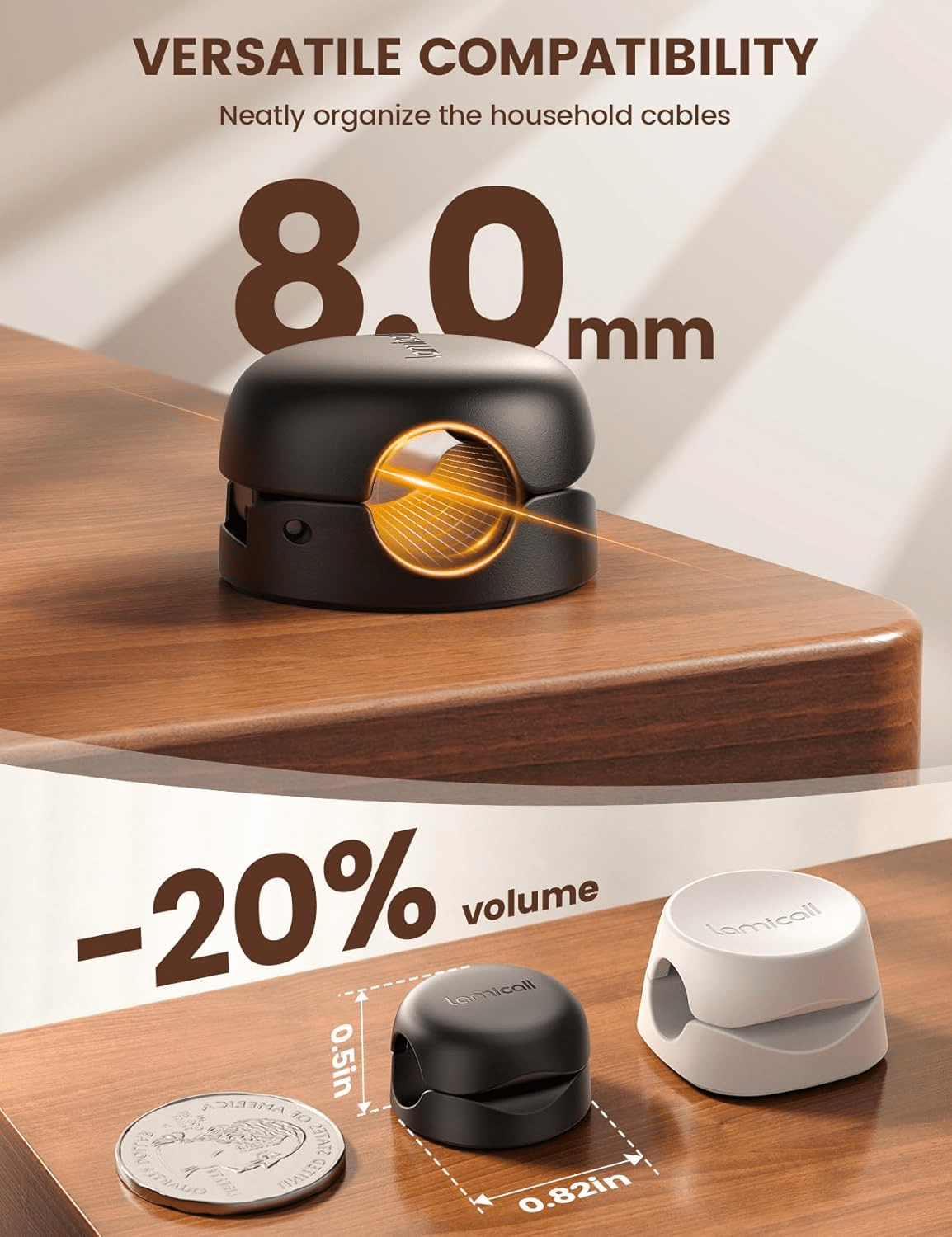 Space-Saving Design: Compact size (0.82”L x 0.82”W x 0.50”H, weight: 3g) fits discreetly in tight spaces. Includes 6 cable organizers to keep cords tidy on desks, nightstands, tables, walls, or in cars.