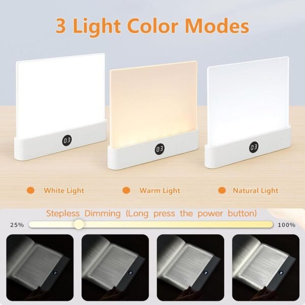 • BOOK NIGHT LIGHT WITH 3 COLOR MODES: This clear panel book light adapts to different reading needs with three color modes: Warm White, Natural White, and Cool White. Warm light creates a cozy bedtime atmosphere, natural light helps you stay focused, and cool light enhances clarity for detailed reading or studying.