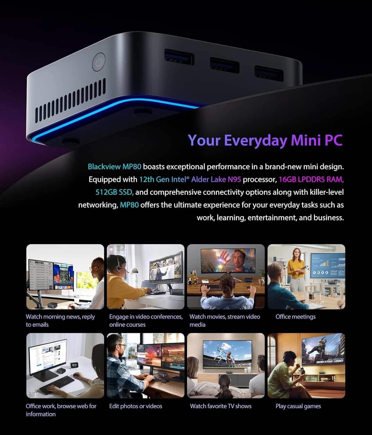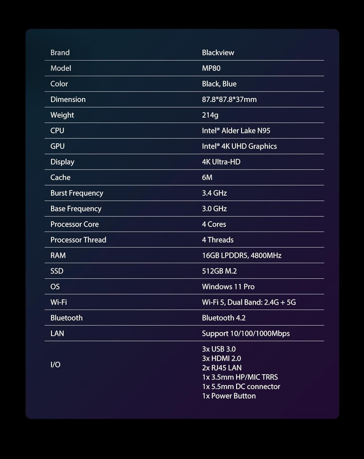 COMPACT AND ROBUST DESIGN: MP80 Mini PC measures only 3.5 in× 3.5 in × 1.5 in and its weight is only 214g which you can easily place in crowded workstations or small spaces. It can support you to do whatever you want and supports 4K output, ultra-clear display.
