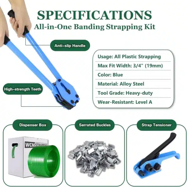 Safe & User-Friendly Design – The WCM Strapping Pallet Packaging Strapping Tool ensures a secure and comfortable strapping experience. It features polished surfaces, sharp wrapped blades for safety and non-slip handles for added protection. The convenient dispense box allows for easy storage and handling of the 1000ft PET strapping coil.