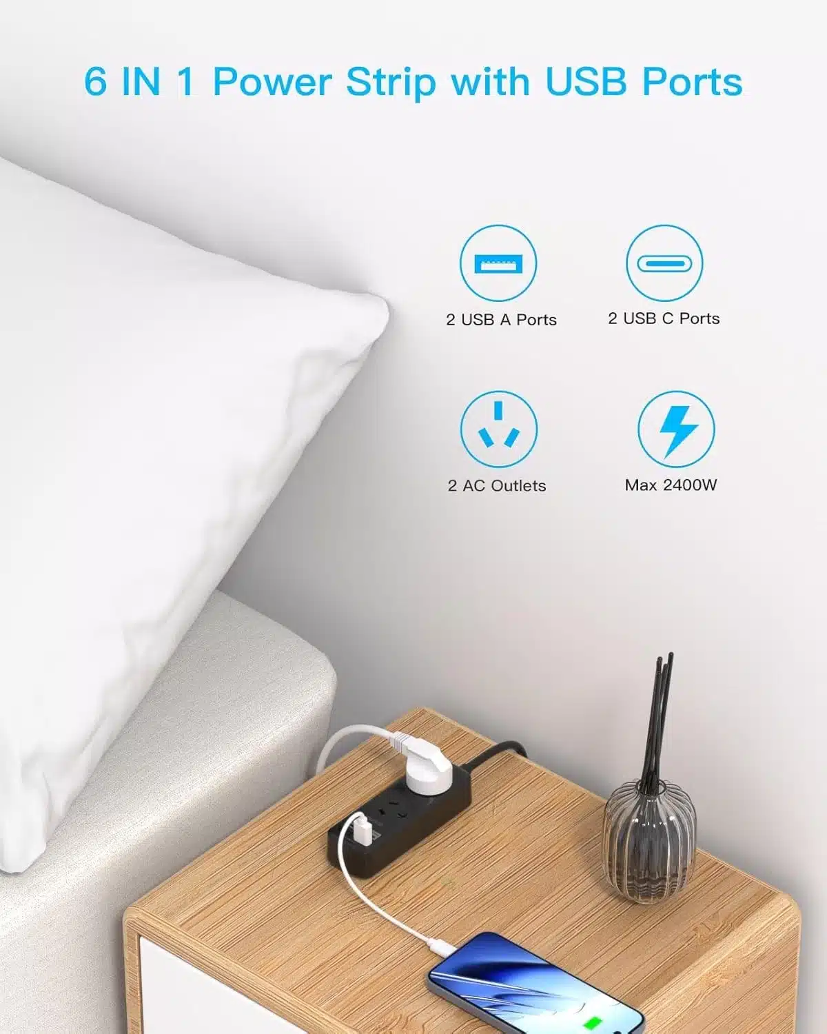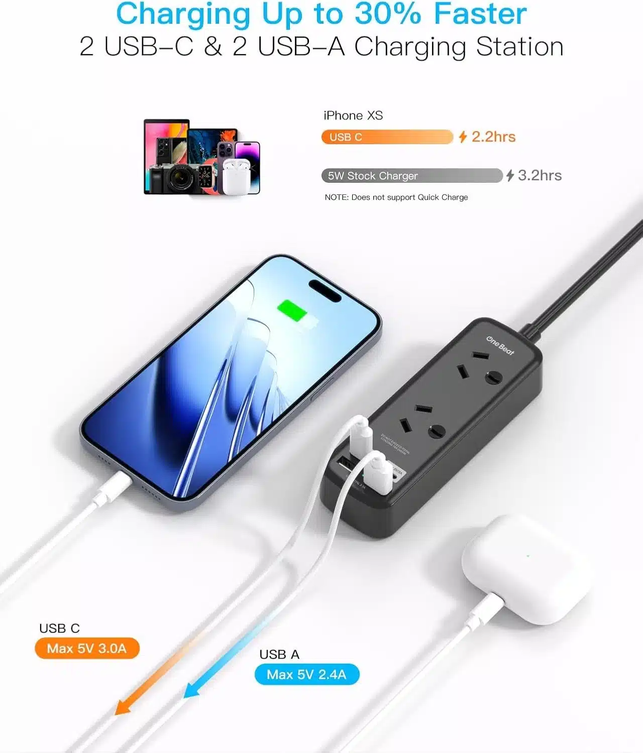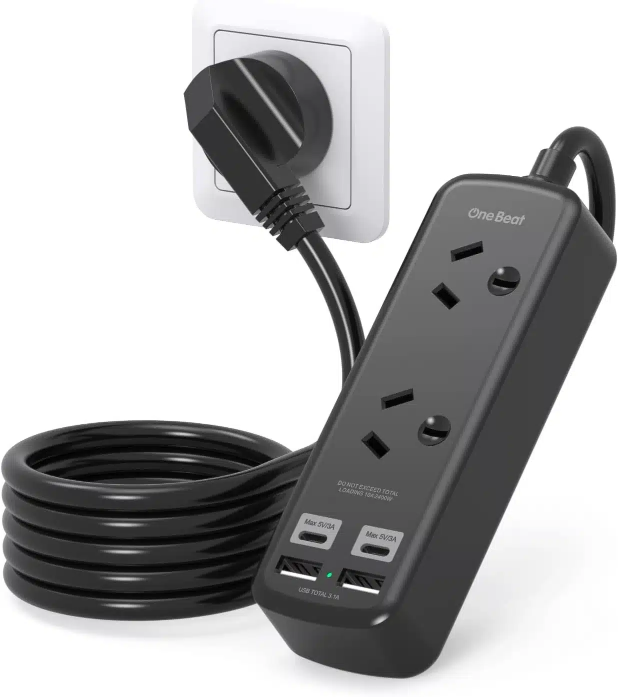【6 in 1 Power Board with USB C】One Beat usb power board with 2 AC Outlets(2400W/10A) + 4 USB ports (total 5V/3.1A), can power up to 6 travel devices simultaneously on your desk from a single small power strip. At only 13*4.5*2.5cm small size, this travel powerboard can fit easily into any package, ideal to bring during business travel and vacations to keep all your travel accessories devices charged.