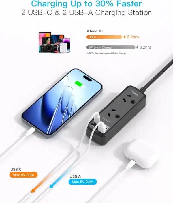 2 USB-C ports provides 5V/3A fast charging, 2 USB-A ports can intelligently charge up to 5V/2.4A.