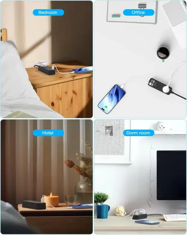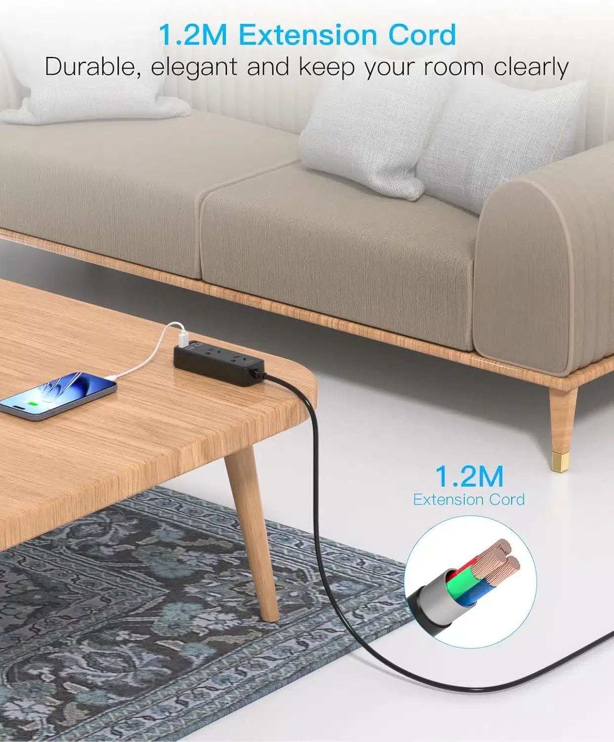 【1.2M Extension Cord】 The power extension cord comes with a 1.2m extension cord made of high-quality fireproof PC material and heat dissipation copper wire. Power Strip with better heat dissipation and conductivity, providing more efficient power supply and safety.The 1.2m extension cord with multi outlets, flexible and durable, great for travel home office dorm room use.