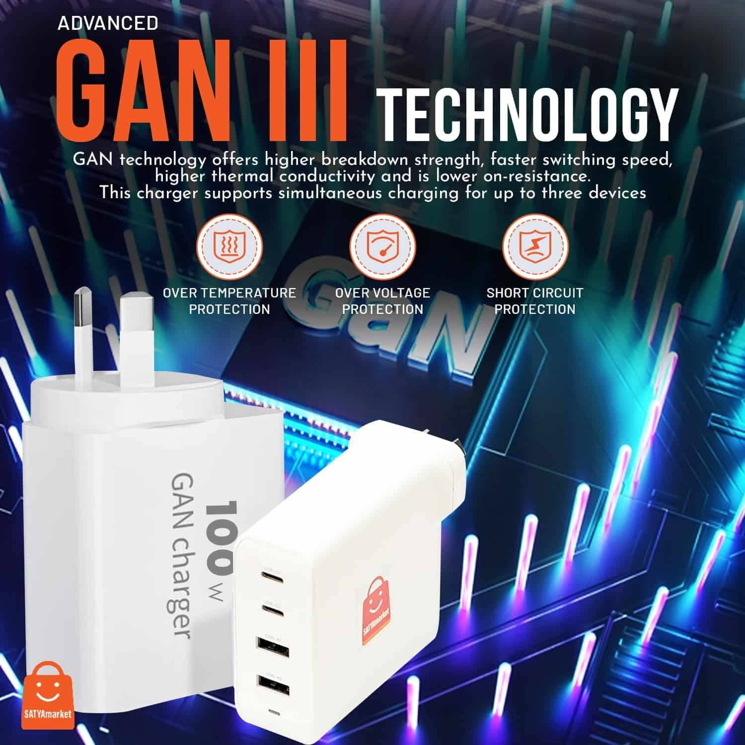 CUTTING-EDGE GAN TECHNOLOGY: SATYAmarket’s 100W GaN Charger utilizes Gallium Nitride semiconductors for superior heat dissipation and energy efficiency, ensuring rapid and reliable charging for all your devices