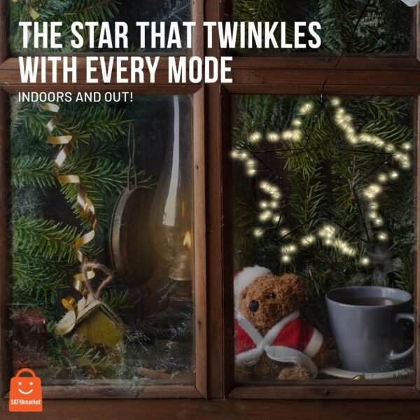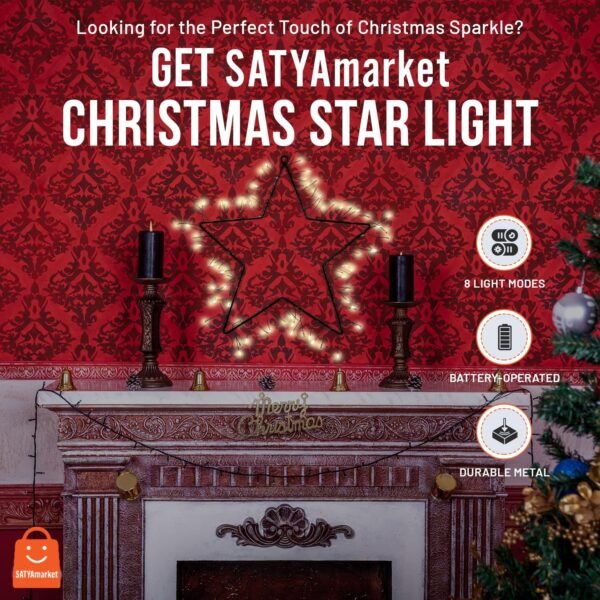 Illuminate your festive celebrations with Satyamarket stunning Christmas Star Light. Featuring a 30cm metal star adorned with 85 warm white LEDs on a black copper wire, it brings a cozy glow to your home or outdoor space.